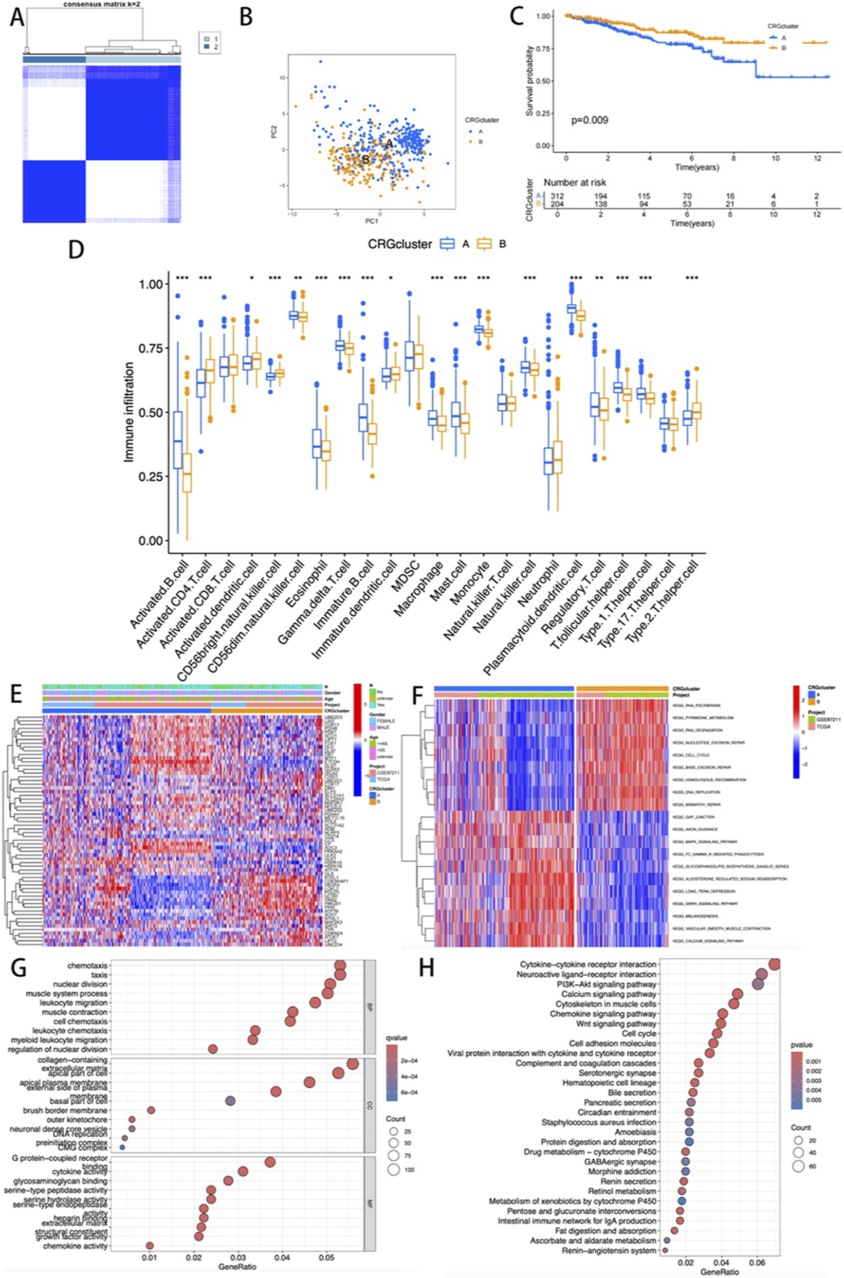 (A) Consensus matrix map of two relevant regions; (B) PCA showing the differences between the two subtypes; (C) K-M survival analysis curve; (D) Evaluation of differences in immune infiltration among 23 key immune cells; (E) The heatmap visualization illustrates the differences in clinical pathological parameters among various CRG expression profile subtypes; (F) GSVA mapping of pathway activities across different clusters. (G,H) GO and KEGG functional enrichment analysis.
