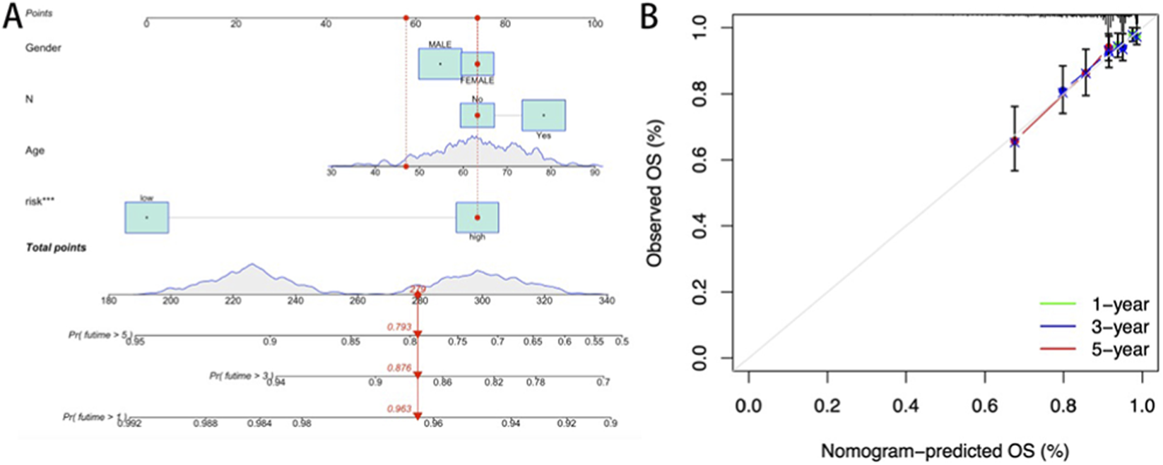 (A) Nomogram constructed based on the risk score and clinicopathological characteristics; (B) Calibration curve of the prognostic model.