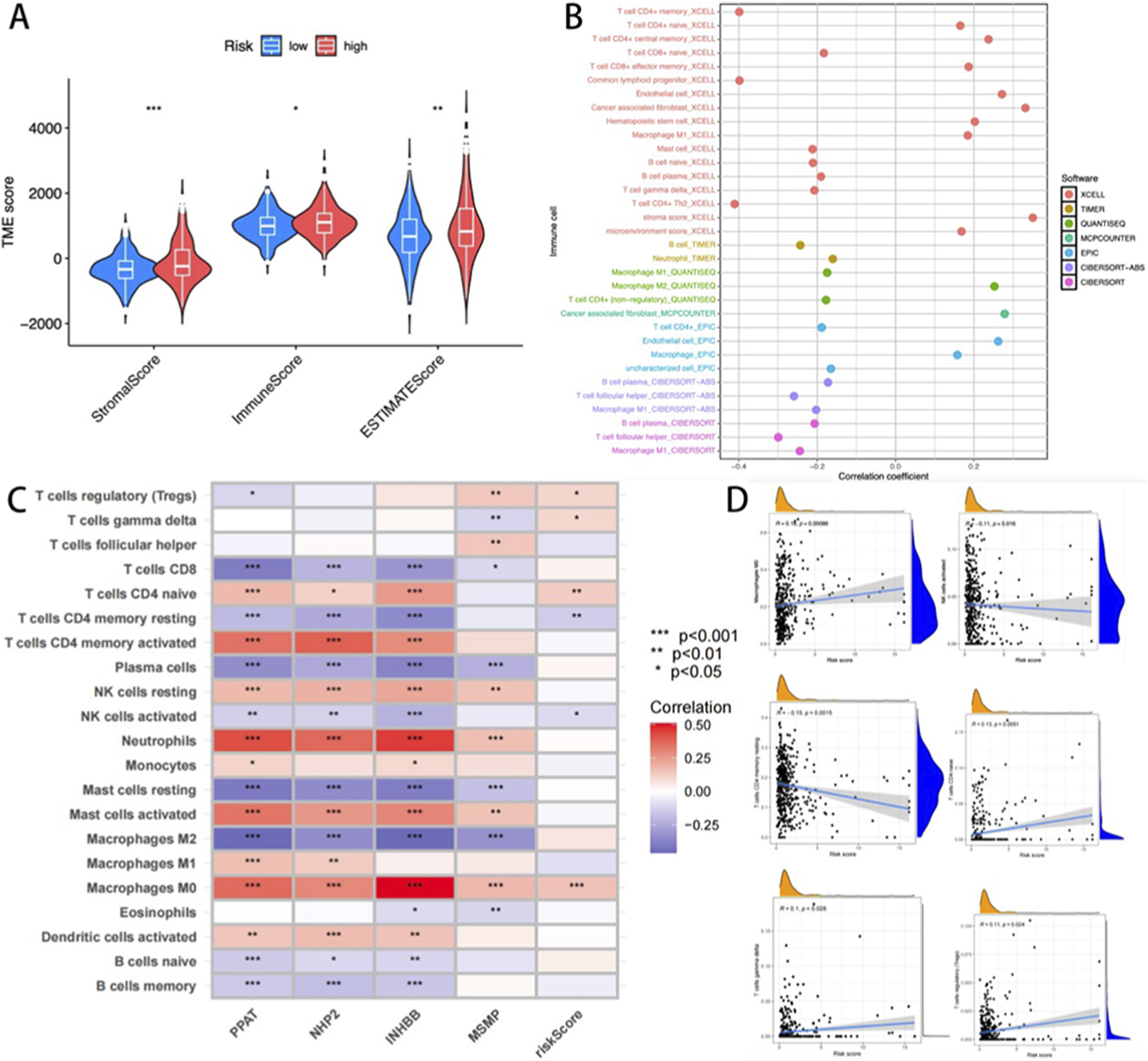 (A) The differences between the high-risk and low-risk groups across the three immune algorithms; (B) Heat maps describing the changes in the content of immune cells in different algorithms; (C) Heat map of the correlation between immune cells and four key genes. (D) Correlation between cuproptosis risk score and six key immune cells (M0 Macrophages, activated NK cells, CD4 memory resting T-cells, CD4 naïve T-cells, gamma delta T-cells, and regulatory T-cells (Tregs).