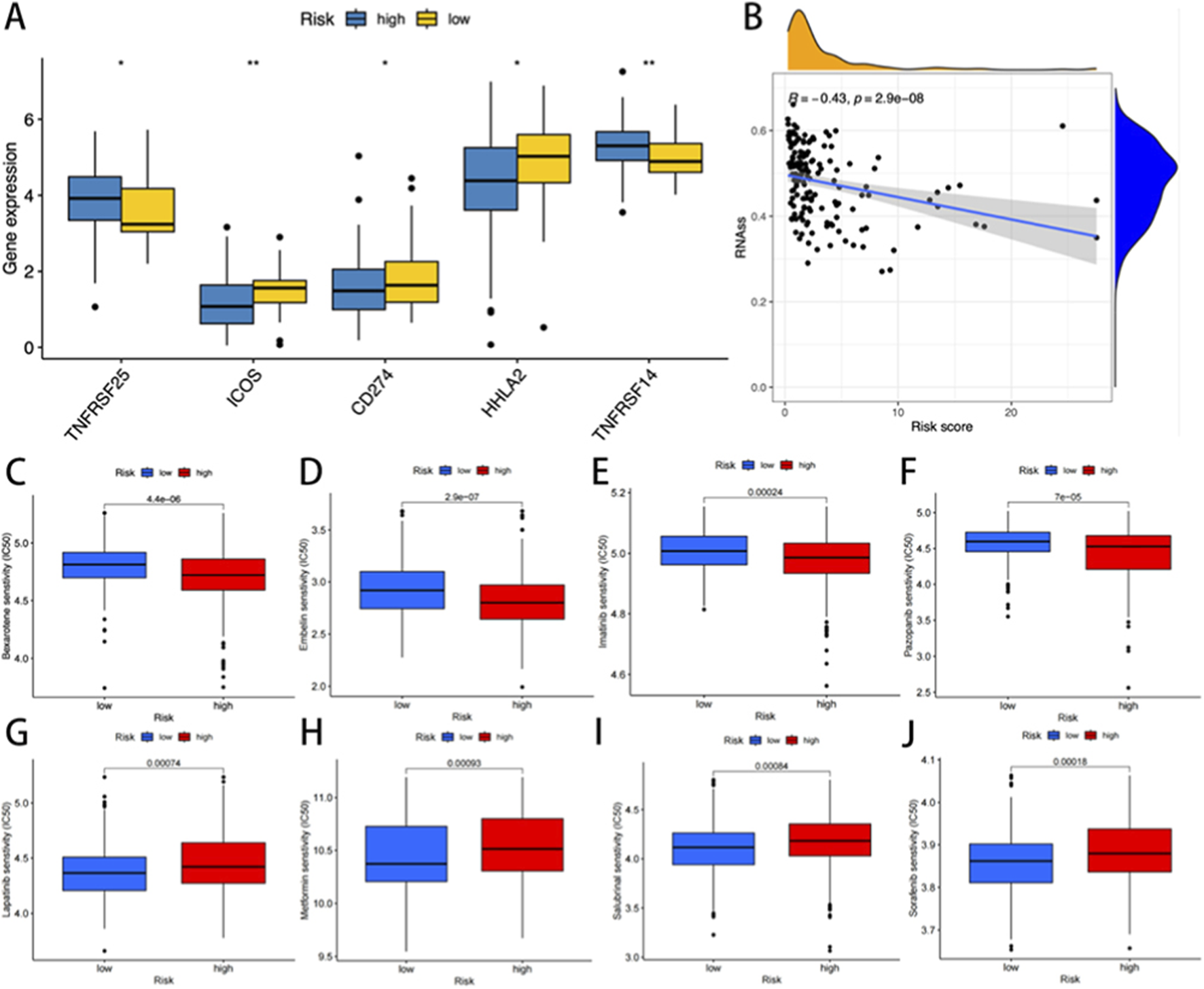 (A) The expression of immune checkpoint genes in the high and low-risk groups. (B) Correlation analysis between cuproptosisrisk score and stem cells. The IC50 was significantly reduced for drugs such as high-risk bexarotene, embelin, imatinib, and pazopanib (C–F). In contrast, the low-risk group showed significantly lower IC50 levels for lapatinib, metformin, salubrinal, and sorafenib (G–J).