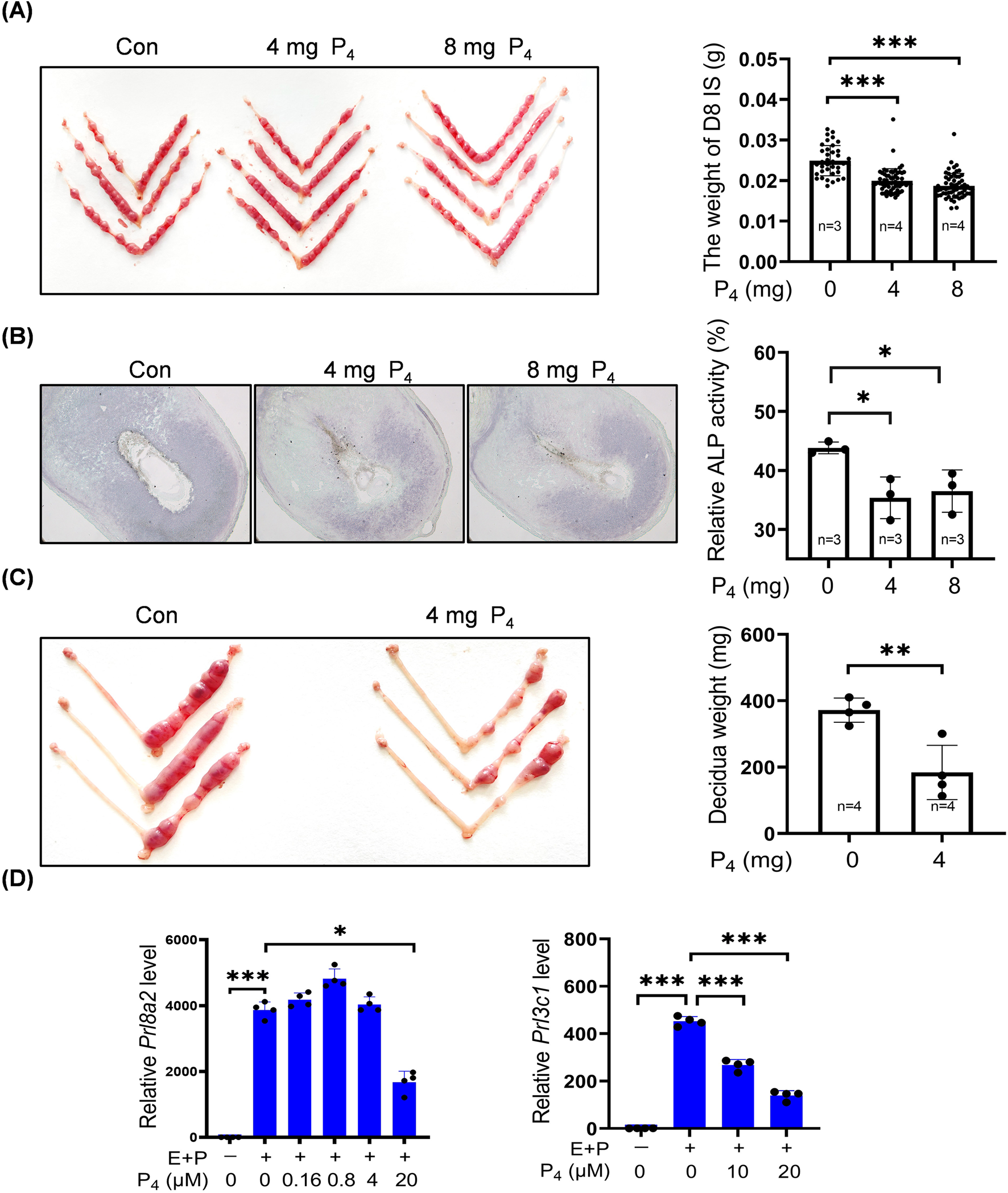Figure 1. Excessive P4 impairs mouse decidualization. (A) Representative images and the decidual weights of implantation site on day 8 of pregnancy after pregnant mice were daily treated with P4 (4 mg or 8 mg) from days 3–7. (B) Alkaline phosphatase staining of day 8 uteri after pregnant mice were treated daily with P4 (4 mg or 8 mg) from days 3–7. (C) Representative images and the decidual weights of day 8 pseudopregnant uteri after pseudopregnant mice under artificial decidualization were treated daily with 4 mg P4 from days 5–7. (D) Effects of P4 treatment on Prl8a2 and Prl3c1 mRNA levels under in vitro decidualization for 2 days. The qPCR values were normalized to the Rpl7 mRNA level. All images are the representative of at least three biologically independent experiments. *, p < 0.05; **, p < 0.01; ***, p < 0.001.