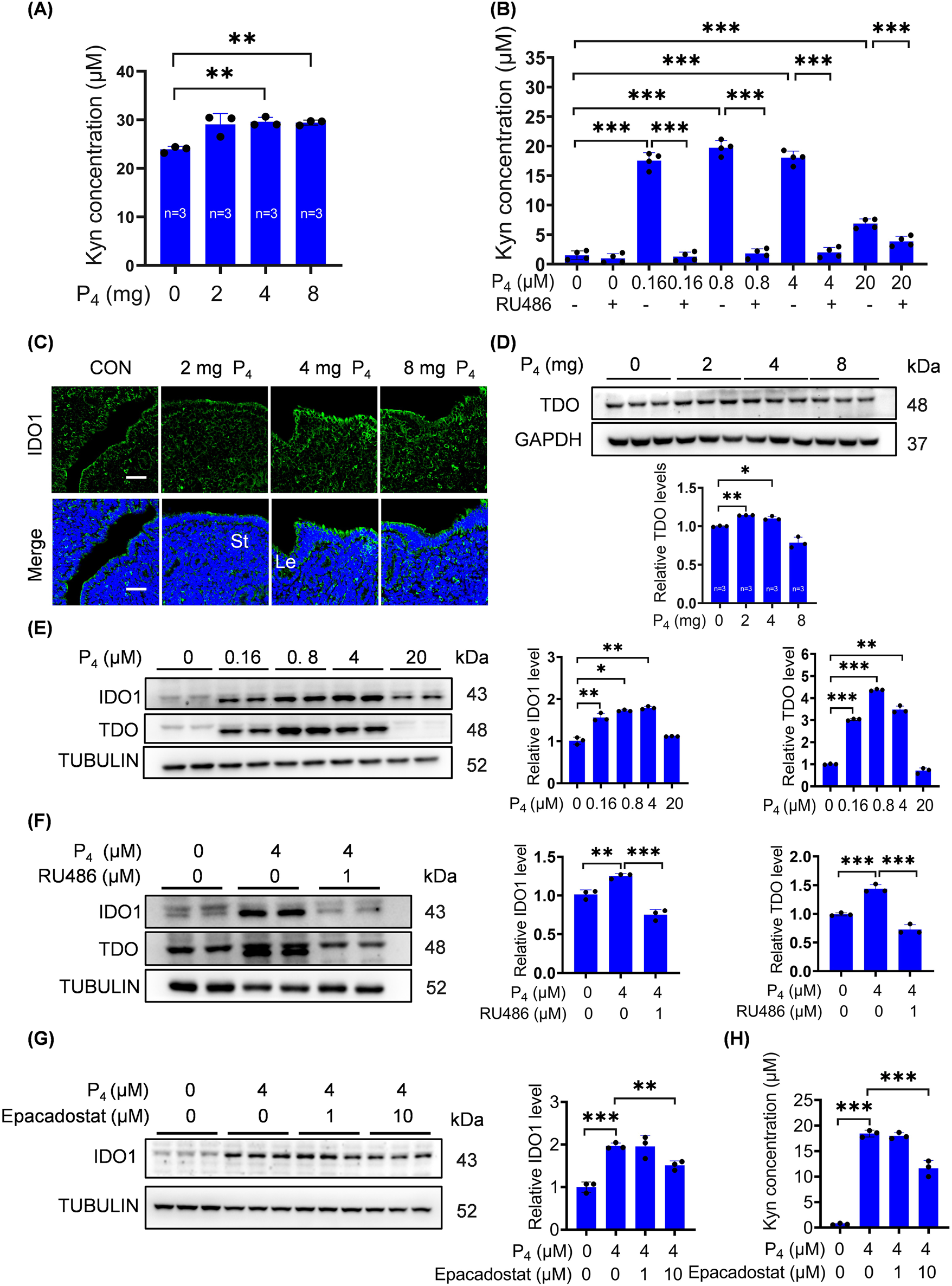 Figure 2. P4 activates the IDO1/TDO-Kyn pathway. (A) Kyn levels in uterine tissues after ovariectomized mice were subcutaneously injected with 2 mg, 4 mg, or 8 mg P4 per mouse for 7 consecutive days. (B) Kyn levels in culture medium after stromal cells were treated with P4 with or without RU486 for 2 days. (C) Uterine IDO1 immunofluorescence after ovariectomized mice were treated with P4 (2 mg, 4 mg, 8 mg) for 24 h. Nuclei were counter-stained with DAPI. Le, luminal epithelia; St, stroma. Scale bar, 50 μm. n = 3 mice per group. (D) Uterine TDO protein levels after ovariectomized mice were treated with P4 for 24 h. (E) Western blot analysis of IDO1 and TDO protein levels in stromal cells treated with P4 for 3 days. (F) IDO1 and TDO protein levels in stromal cells treated with 4 μM P4 with or without RU486 for 2 days. (G) IDO1 protein levels in stromal cells treated with 4 μM P4 with or without Epacadostat for 2 days. (H) Kyn levels in the culture medium after stromal cells were treated with 4 μM P4 with or without Epacadostat for 2 days. All images are the representative of at least three biologically independent experiments. *, p < 0.05; **, p < 0.01; ***, p < 0.001.