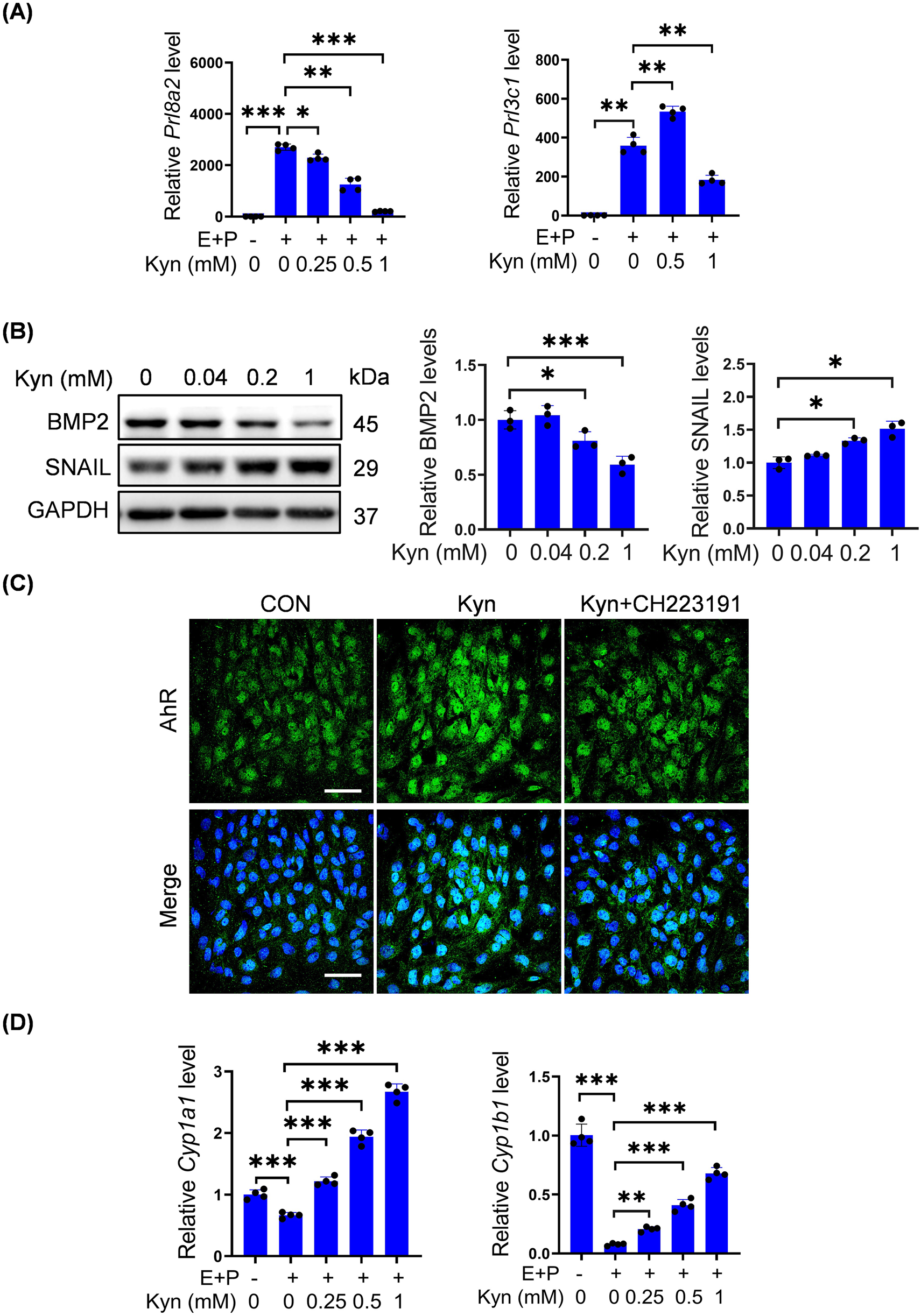 Figure 3. Kyn impairs decidualization of mouse stromal cells and activates AhR. (A) Prl8a2 and Prl3c1 mRNA levels after stromal cells were treated with Kyn for 2 days under in vitro decidualization. (B) Western blot analysis and quantification of BMP2 and SNAIL protein levels in stromal cells treated with Kyn for 2 days. (C) AhR fluorescence in stromal cells treated with 1 mM Kyn with or without 10 μM CH223191 for 24 h. Nuclei were counter-stained with DAPI. Scale bar, 50 μm. (D) The mRNA levels of Cyp1a1 and Cyp1b1 after stromal cells were treated with Kyn for 2 days under in vitro decidualization. All images are the representative of at least three biologically independent experiments. *, p < 0.05; **, p < 0.01; ***, p < 0.001.