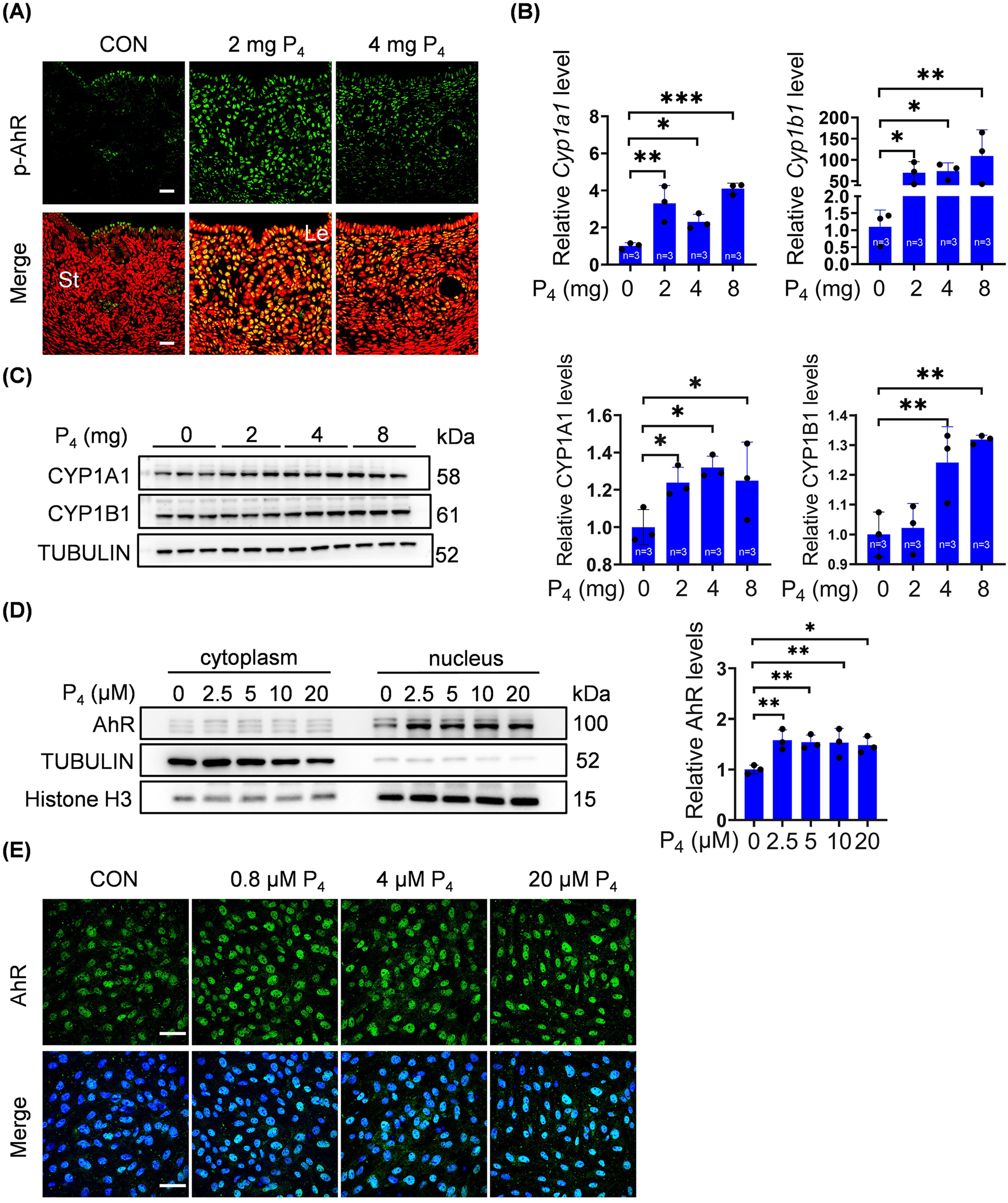 Figure 4. P4 activates AhR pathway. (A) Uterine phosphorylated AhR immunofluorescence after ovariectomized mice were treated with 2 mg or 4 mg P4 for 7 days. Nuclei were counter-stained with PI. Le, luminal epithelia; St, stroma. Scale bar, 20 μm. n = 3 mice per group. (B) Uterine mRNA levels of Cyp1a1 and Cyp1b1 after ovariectomized mice were treated with 2, 4 or 8 mg P4 for 7 days. (C) Western blot analysis and quantification of uterine CYP1A1 (3 days injection) and CYP1B1 (7 days injection) protein levels after ovariectomized mice were treated with 2, 4 or 8 mg P4. (D) Western blot analysis of AhR protein level in nuclear and cytoplasmic fractions, and quantification of AhR in nuclear fractions after stromal cells were treated with P4 for 48 h (E) AhR immunofluorescence in stromal cells treated with 0.8, 4, or 20 μM P4 for 48 h. Nuclei were counterstained with DAPI. Scale bar: 50 μm. All images are the representative of at least three biologically independent experiments. *, p < 0.05; **, p < 0.01; ***, p < 0.001.
