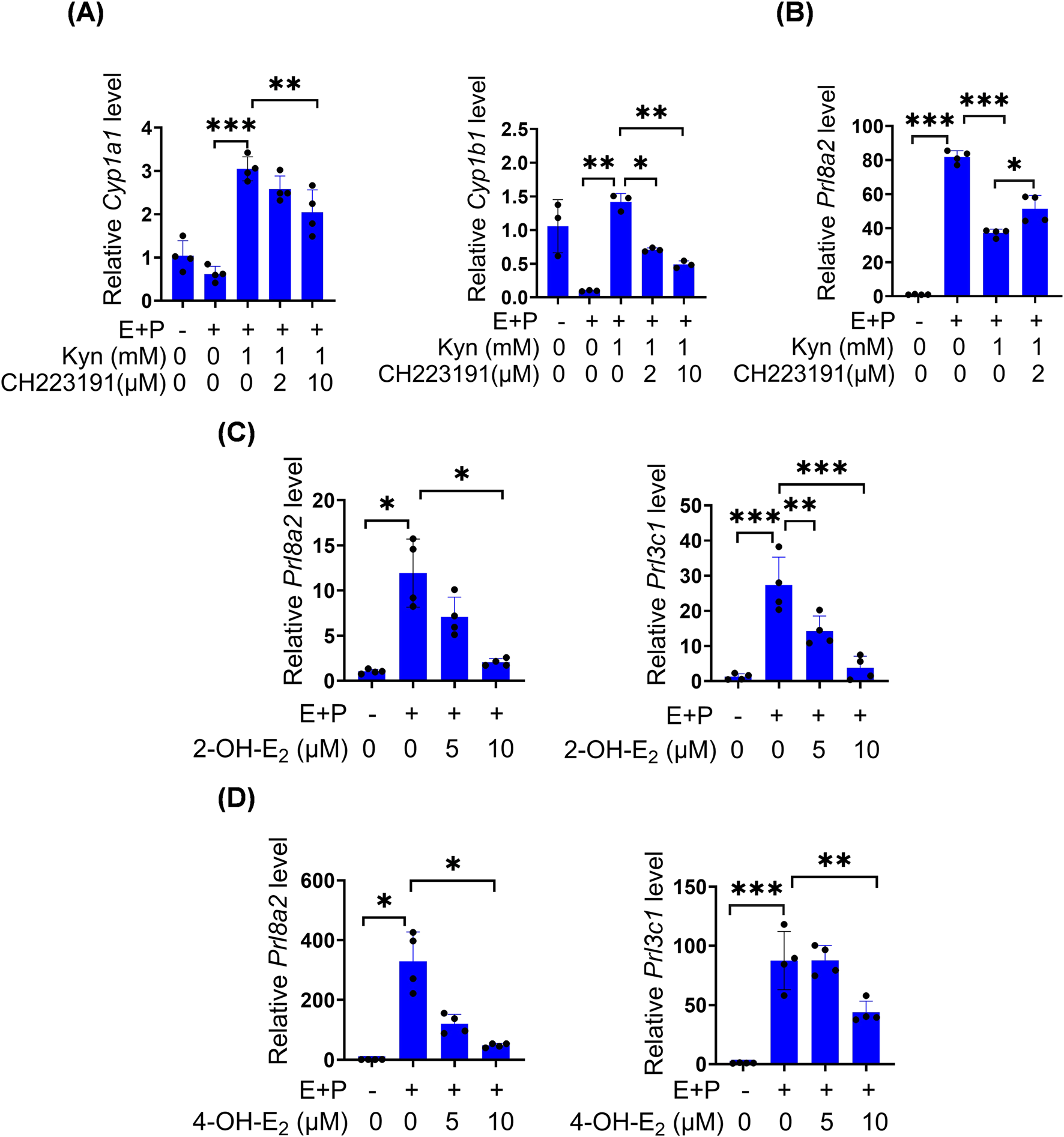 Figure 5. Kyn inhibits mouse stromal cell decidualization through activating AhR. (A) The mRNA levels of Cyp1a1 and Cyp1b1 after stromal cells under in vitro decidualization were treated with Kyn for 48 h with or without AhR inhibitor CH223191. (B) Prl8a2 mRNA level after stromal cells under in vitro decidualization were treated with Kyn for 24 h with or without CH223191. (C) The mRNA levels of Prl8a2 and Prl3c1 after stromal cells were treated with 2-OH-E2 for 12 h under in vitro decidualization. (D) The mRNA levels of Prl8a2 and Prl3c1 after stromal cells were treated with 4-OH-E2 for 24 h under in vitro decidualization. All images are the representative of at least three biologically independent experiments. *, p < 0.05; **, p < 0.01; ***, p < 0.001.