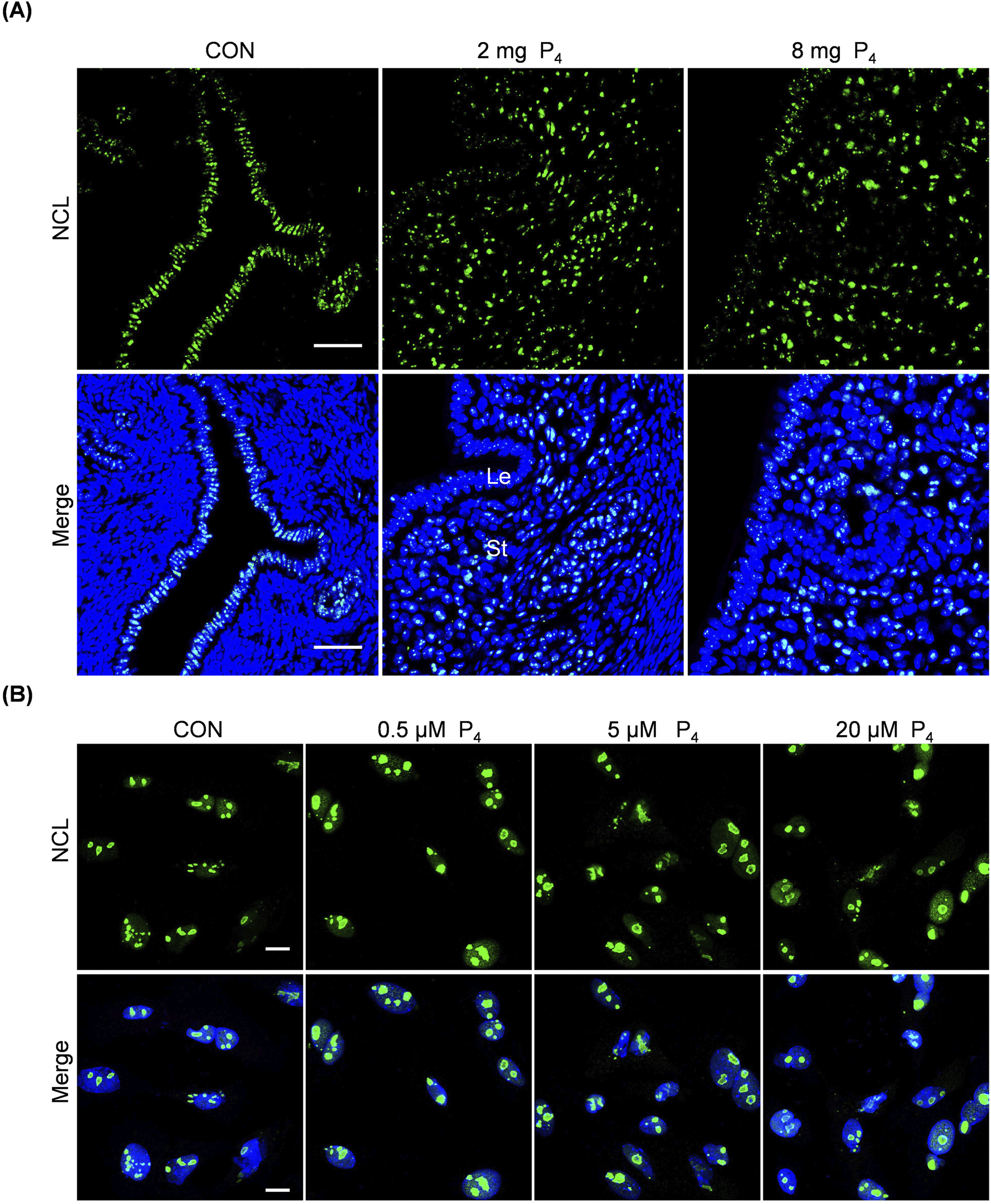 Figure 6. Effects of excessive P4 on nucleolus. (A) Uterine NCL immunofluorescence after ovariectomized mice were subcutaneously injected with 2 or 8 mg P4 for 7 days. Nuclei were counter-stained with DAPI. Le, luminal epithelia; St, stroma. Scale bar, 50 μm. n = 3 mice per group. (B) NCL immunofluorescence after stromal cells were treated with 0.5,5 or 20 μM P4 for 24 h. Nuclei were counter-stained with DAPI. Scale bar, 20 μm. All images are the representative of at least three biologically independent experiments.