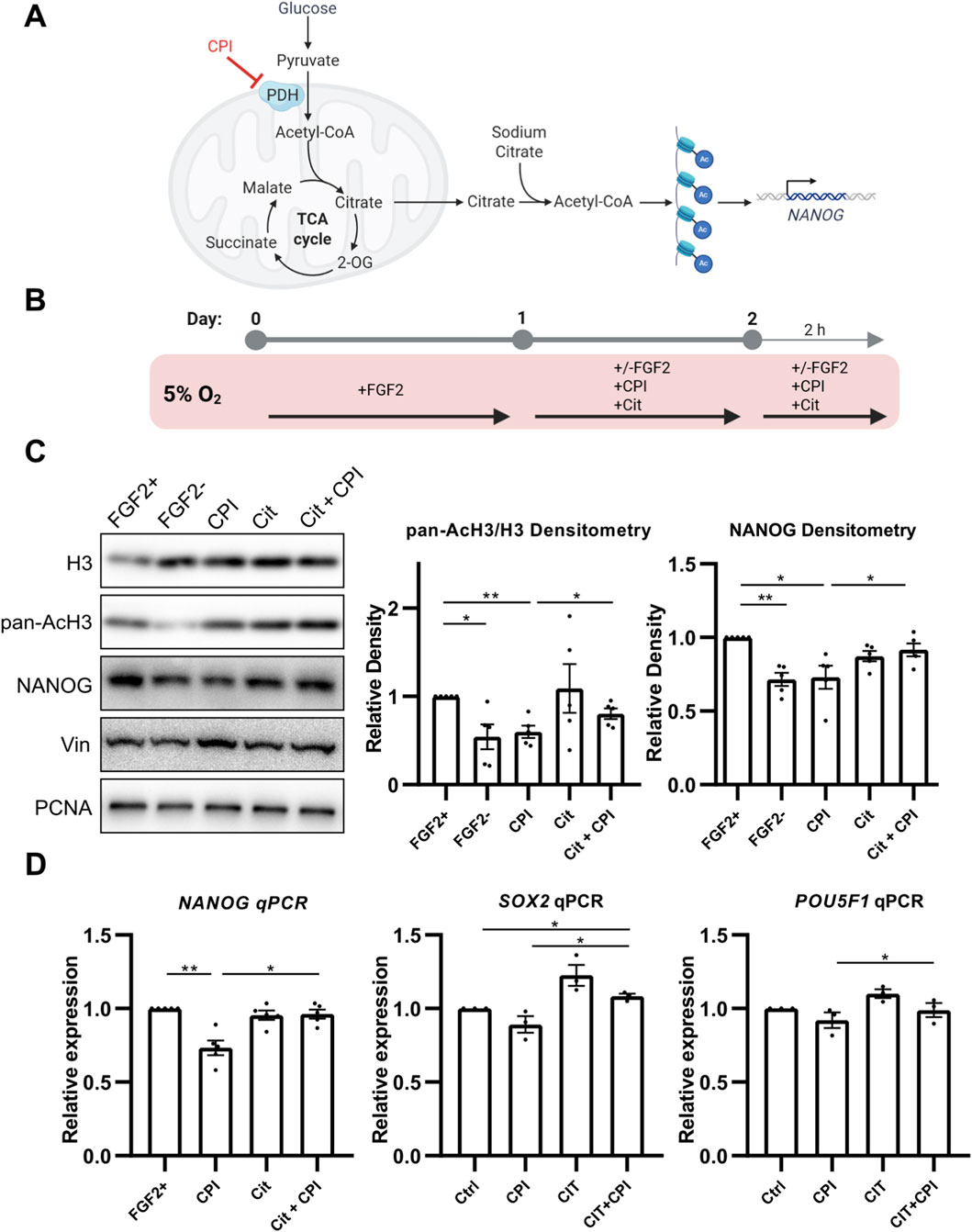 Pluripotency, histone acetylation, cellular metabolism, oxygen levels, ROS, and FGF2 signaling are intricately connected within a complex regulatory network. In this study, we aimed to elucidate the role of PDH in producing Ac-CoA for histone acetylation, and to assess its downstream impact on pluripotency maintenance by focusing on the expression of NANOG, a core pluripotency marker known for its dynamic fluctuation in hPSC cultures (Hayashi et al., 2019; Kalmar et al., 2009; M. Li and Izpisua Belmonte, 2018) with particular sensitivity to histone acetylation (Hattori et al., 2007; Horne et al., 2014; M. S. Kim et al., 2015).