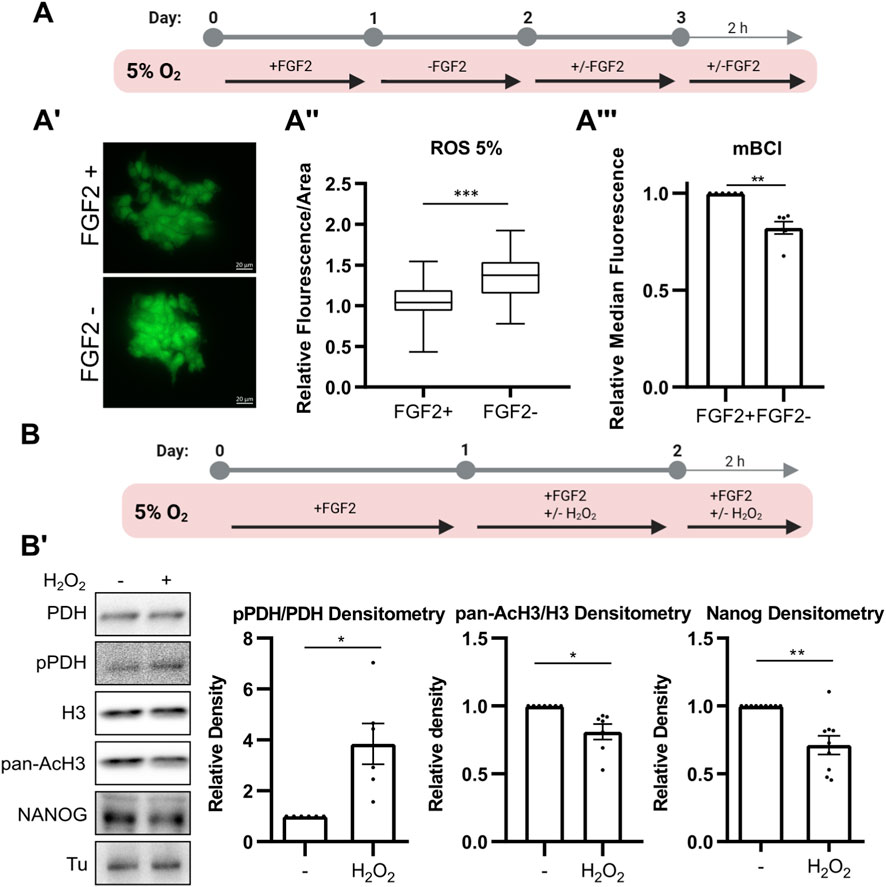 Finally, building on our previous findings that ROS modulate FGF2 signaling and suppress pluripotency in hPSCs (Fojtík et al., 2021), we further explored whether ROS levels also regulate PDH activity and histone acetylation, aiming to unravel the complex interplay between metabolic regulation, redox signaling, and epigenetic control in maintaining hPSC pluripotency.