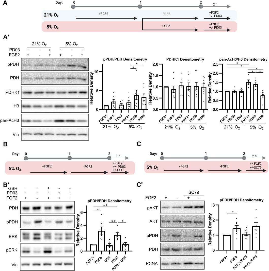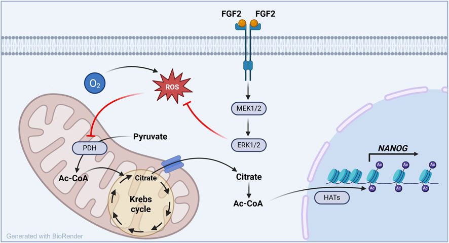 Results: Active PDH promoted global histone H3 acetylation and upregulated the expression of the pluripotency factor NANOG, specifically under 5% O₂. Mechanistic analysis revealed a novel FGF2–MEK1/2–ERK1/2–ROS signaling axis that regulates PDH activity through redox-sensitive mechanisms. This regulatory pathway was oxygen-dependent and absent under atmospheric oxygen levels (21% O₂).