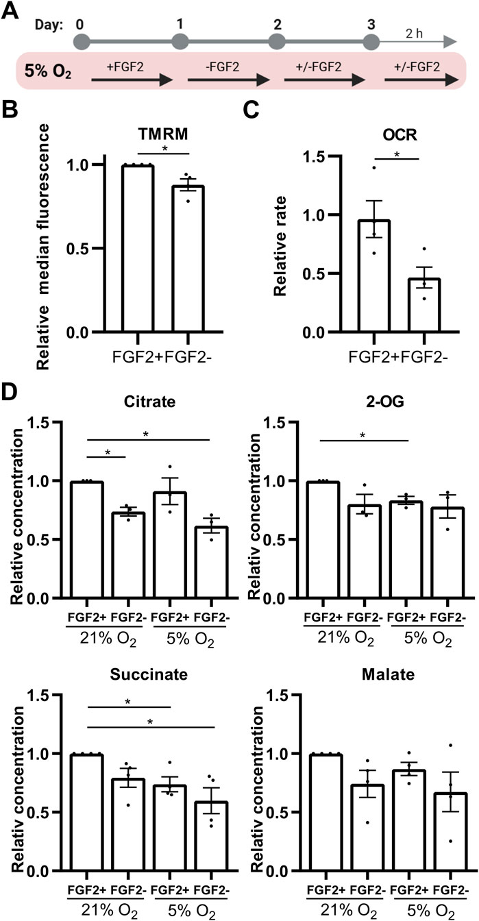 Metabolite concentrations were normalized to the total metabolite content in each sample and relativized to FGF2-treated cells under 21% O2 conditions.