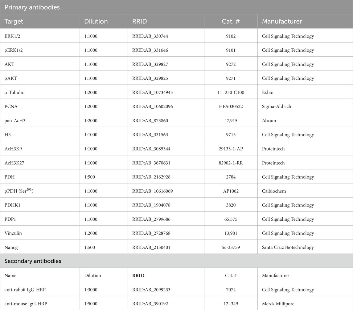 The maintenance of pluripotency in vitro depends on cytokine-triggered signaling cascades, including fibroblast growth factor 2 (FGF2), which activates pluripotency genes through MEK1/2-ERK1/2 and PI3K/AKT pathways (Geary and Labonne, 2018; Haghighi et al., 2018; J. Li et al., 2007; Wang et al., 2017). These pathways not only regulate key transcription factors such as OCT-4, SOX2, and NANOG (Kelly et al., 2020) but also enhance glycolytic metabolism in hPSCs. ERK1/2 regulates key glycolytic enzymes (Papa et al., 2019; Yang et al., 2012), while PI3K/AKT signaling, together with mTOR, supports glucose uptake, nutrient sensing, and anabolic processes, further promoting glycolytic flux (Gottlob et al., 2001; Robey and Hay, 2009; Saxton and Sabatini, 2017; Zhou et al., 2020). Therefore, by promoting glycolysis, FGF2 can support Ac-CoA production, linking energy metabolism with pluripotency maintenance.