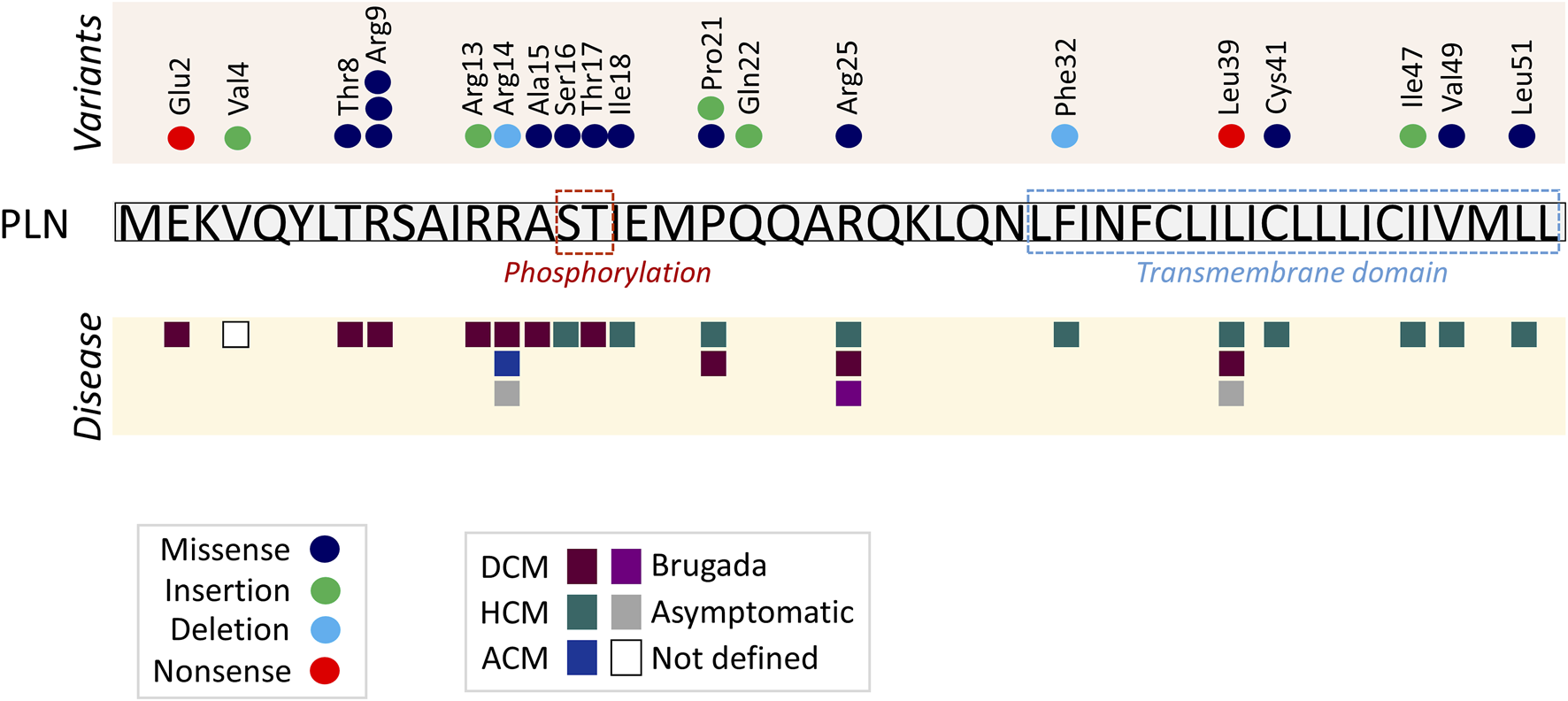 The majority of published pathogenic PLN variants lie in the coding region, and they include missense and nonsense substitutions, as well as small deletions or insertions. While missense substitutions represent the most frequent type of variant, only a few have been well characterized.