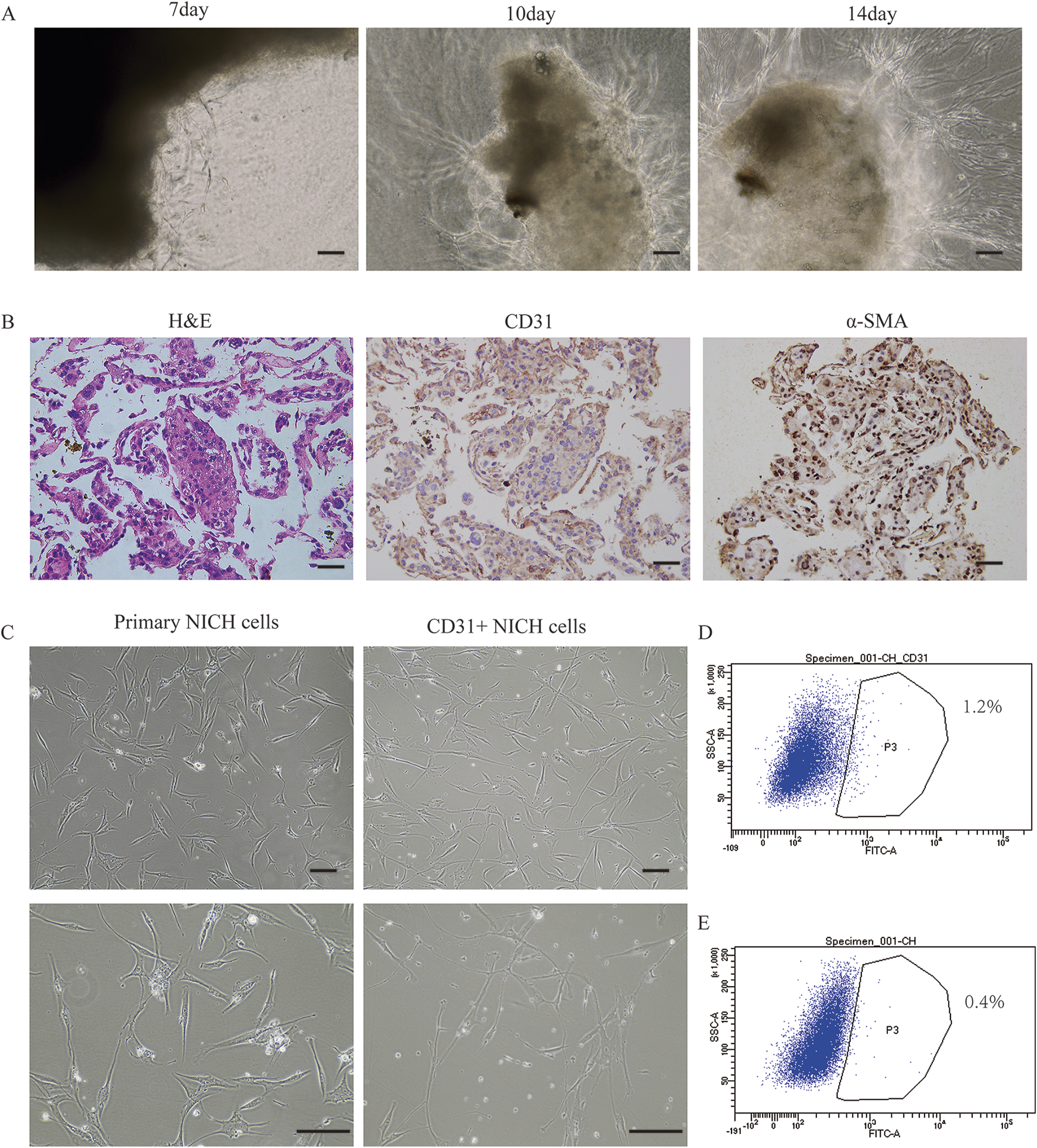 Isolation and cultivation of NICH cells. (A) Progressive derivation of cells from the NICH tumor mass at days 7, 10, and 14. (B) Hematoxylin and eosin (H&E), CD31, and α-smooth muscle actin (α-SMA) staining of cells progressively derived from the NICH tumor mass. (C) Primary NICH cells and CD31+ NICHECs. (D) CD31-positive cell sorting. (E) Negative control for cell sorting. Scale bars = 100 μm.