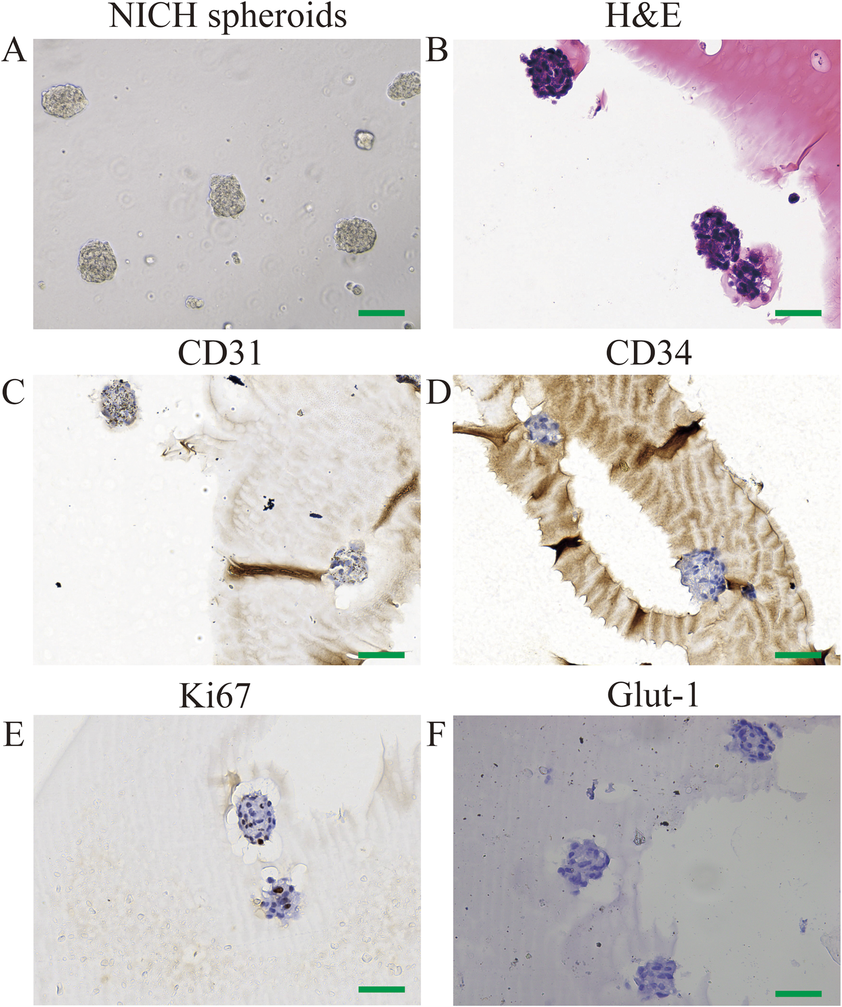A set of six microscopic images labeled A through F showing NICH spheroids with different stains. A displays unstained spheroids. B shows spheroids with H&E staining. C and D depict spheroids stained with CD31 and CD34 respectively, highlighting specific markers. E presents spheroids stained for Ki67, indicating cell proliferation. F shows Glut-1 staining, related to glucose transport. Each image is marked with a green scale bar for reference.