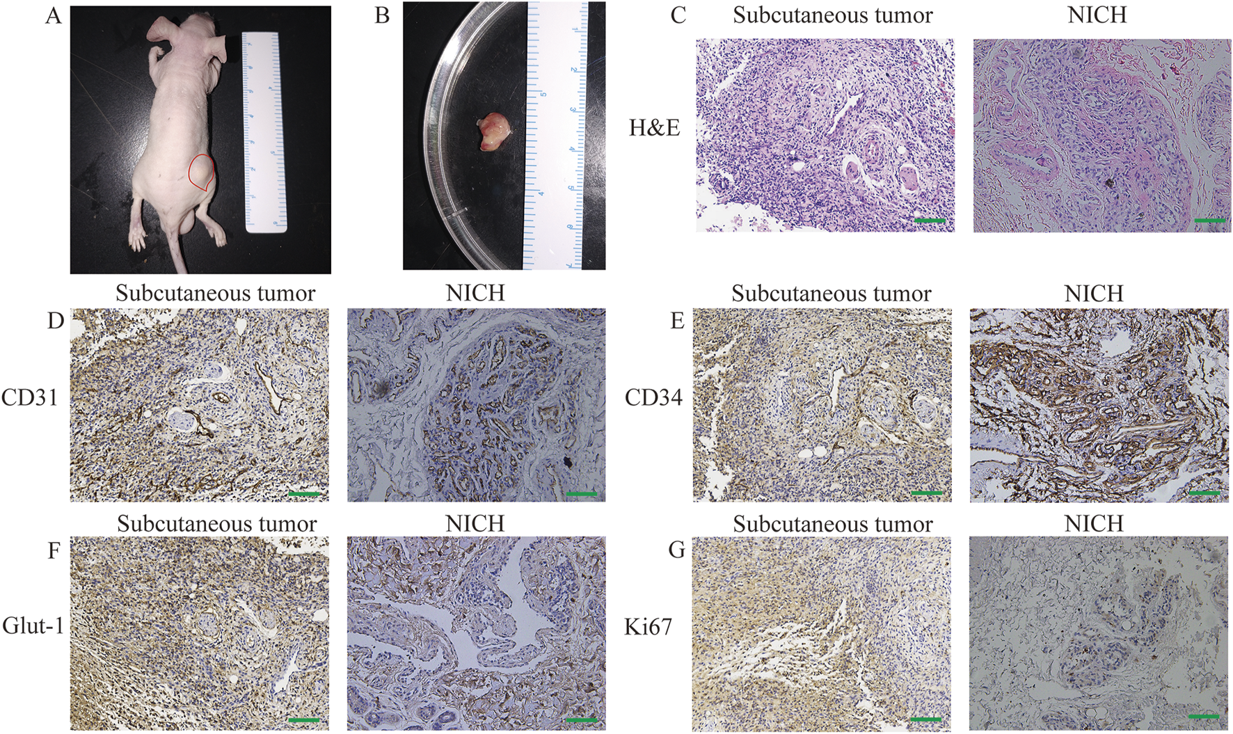 Panel A shows a mouse with a subcutaneous tumor marked by a red outline. A ruler indicates size. Panel B displays the excised tumor on a petri dish next to a ruler. Panel C illustrates hematoxylin and eosin (H&E) stained sections comparing subcutaneous tumor and NICH. Panel D shows CD31 staining of both tissues. Panel E depicts CD34 staining comparisons. Panel F presents Glut-1 staining analysis. Panel G shows Ki67 staining in tumor and NICH tissues. Green scale bars are visible in microscopy images for reference.