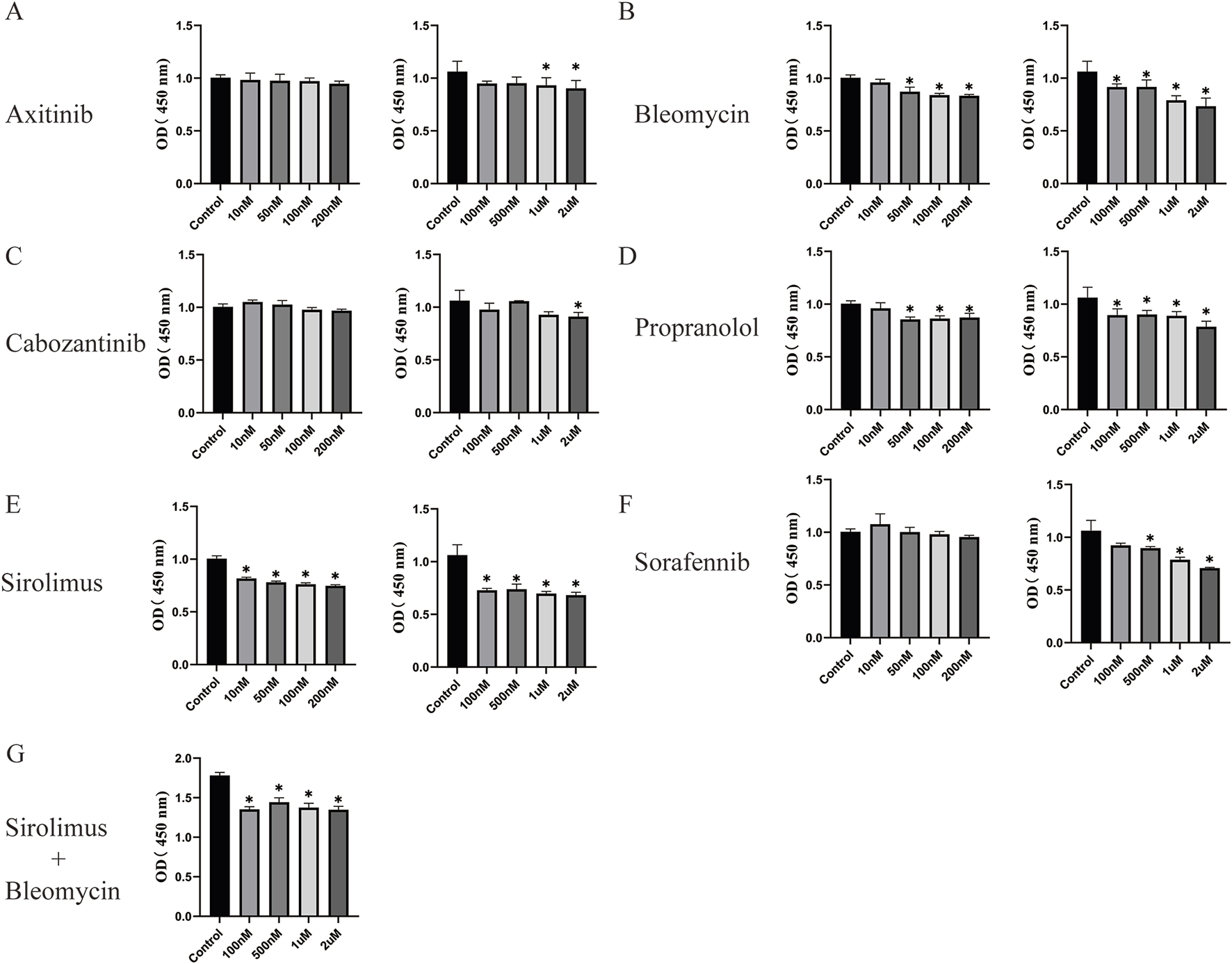 Seven bar graphs labeled A to G, showing OD (450 nm) measurements for different treatments and concentrations: A) Axitinib, B) Bleomycin, C) Cabozantinib, D) Propranolol, E) Sirolimus, F) Sorafenib, G) Sirolimus + Bleomycin. Each graph compares control with increasing concentrations, noting significant changes with asterisks.