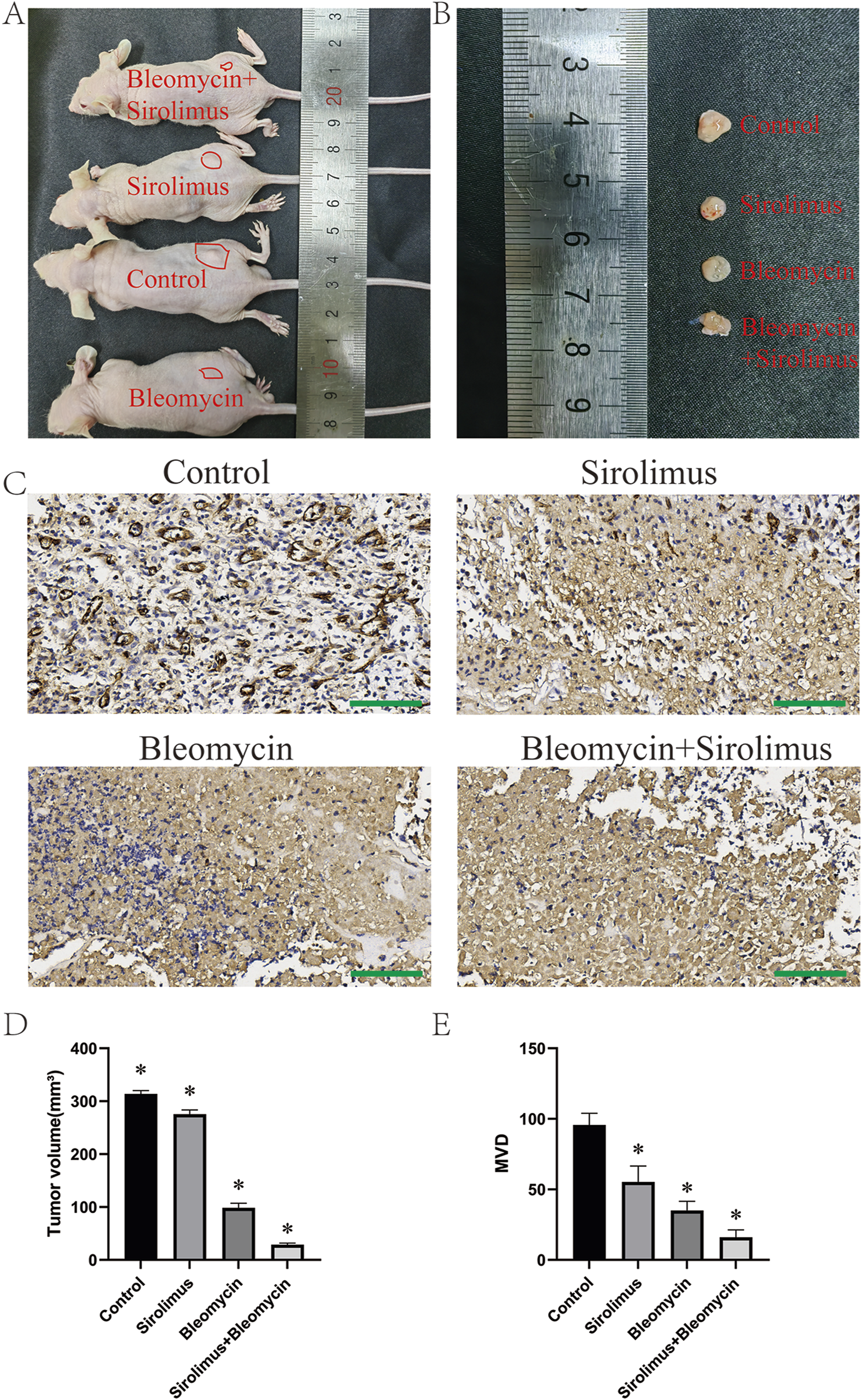 In the subcutaneous tumor formation experiment conducted with nude mice, following a 20-day feeding period, bleomycin, sirolimus, or their combination were administered via injection into the subcutaneous tumors over the course of 1 week (Figure 5A). The mice were subsequently euthanized, and tumor specimens were harvested for volumetric analysis. The findings indicated that the administration of bleomycin, sirolimus, or their combination resulted in significant regression of the subcutaneous tumors (Figure 5B). Subsequent analysis of microvessel density (MVD) differences via immunohistochemical (IHC) staining with the CD31 antibody revealed that all treatment modalities resulted in a reduction in vascular density within the tumors (Figure 5C). Notably, combination therapy had the most pronounced effect (Figures 5D,E).