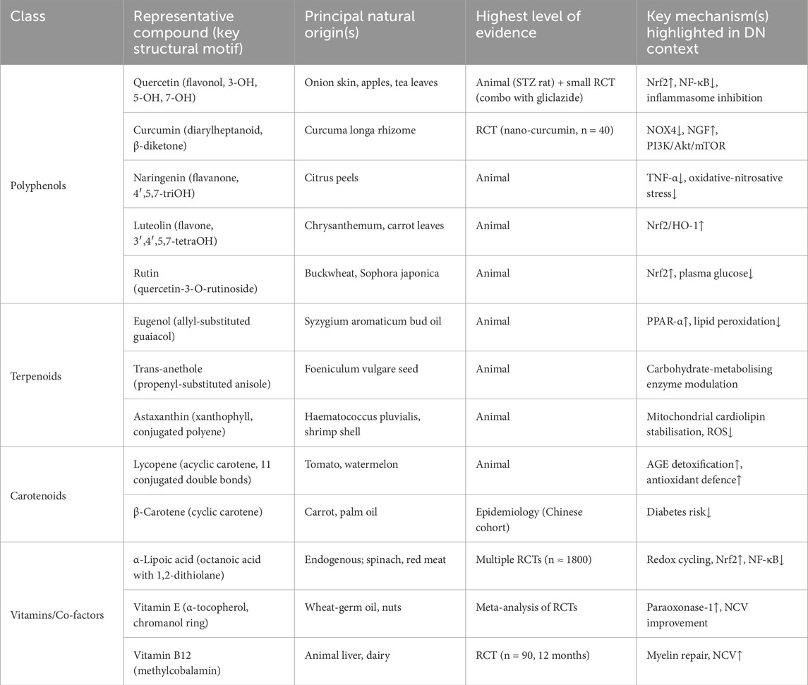 Polyphenols, which are abundant in various fruits, vegetables, and beverages, exhibit strong antioxidant properties, have garnered significant attention in the treatment of DN because their multifaceted roles in mitigating OS and inflammation associated with diabetes. This group includes flavonoids, phenolic acids, and tannins, which are widely recognized for their antioxidant capacity. Quercetin is a kind of flavonoid, which could reduce blood glucose levels and improve lipid profiles, inhibit inflammasome activation and reduce OS, demonstrating its potential as a therapeutic agent in inflammatory diseases (Domiciano et al., 2017; Ahmad et al., 2017). Additionally, polyphenols from the flower of Hibiscus syriacus have been reported to ameliorate neuroinflammation, exerting neuroprotective effects (Zhang et al., 2020). Naringenin ameliorates DN pain by modulating oxidative-nitrosative stress and inflammatory cytokines, thereby improving nerve conduction velocity and reducing pain perception in diabetic rats (Kandhare et al., 2012). Additionally, the flavonoid-rich fraction of Tephrosia purpurea was reported to ameliorate hyperglycemia and cardiovascular complications associated with diabetes (Bhadada and Goya, 2016).