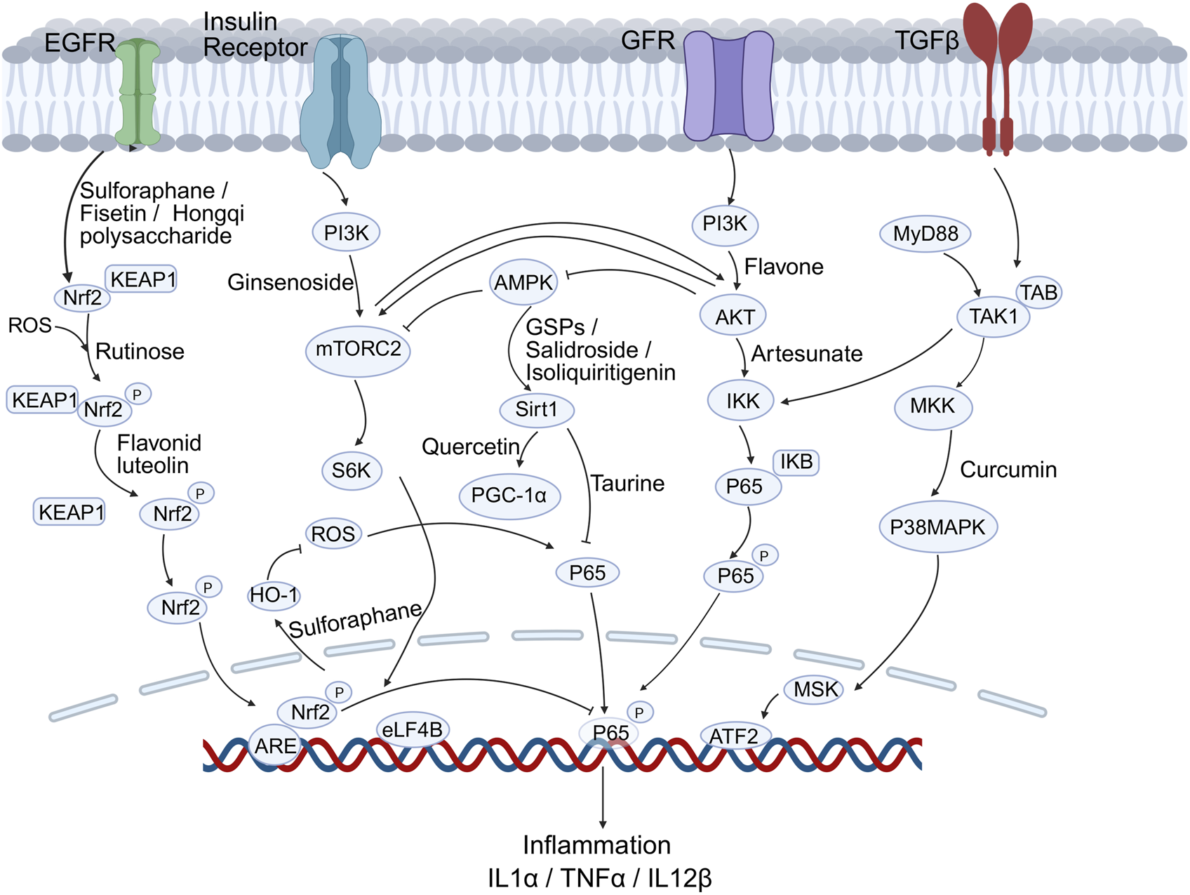 Key signalling cascades modulated by natural antioxidants in DN. Compounds such as Sulforaphane, Fisetin, Quercetin, Curcumin and Taurine activate the Nrf2/Keap1-ARE, PI3K-Akt-mTOR and SIRT1-PGC-1α pathways while inhibiting NF-κB–driven inflammation (IL-1β, TNF-α, IL-12β).
