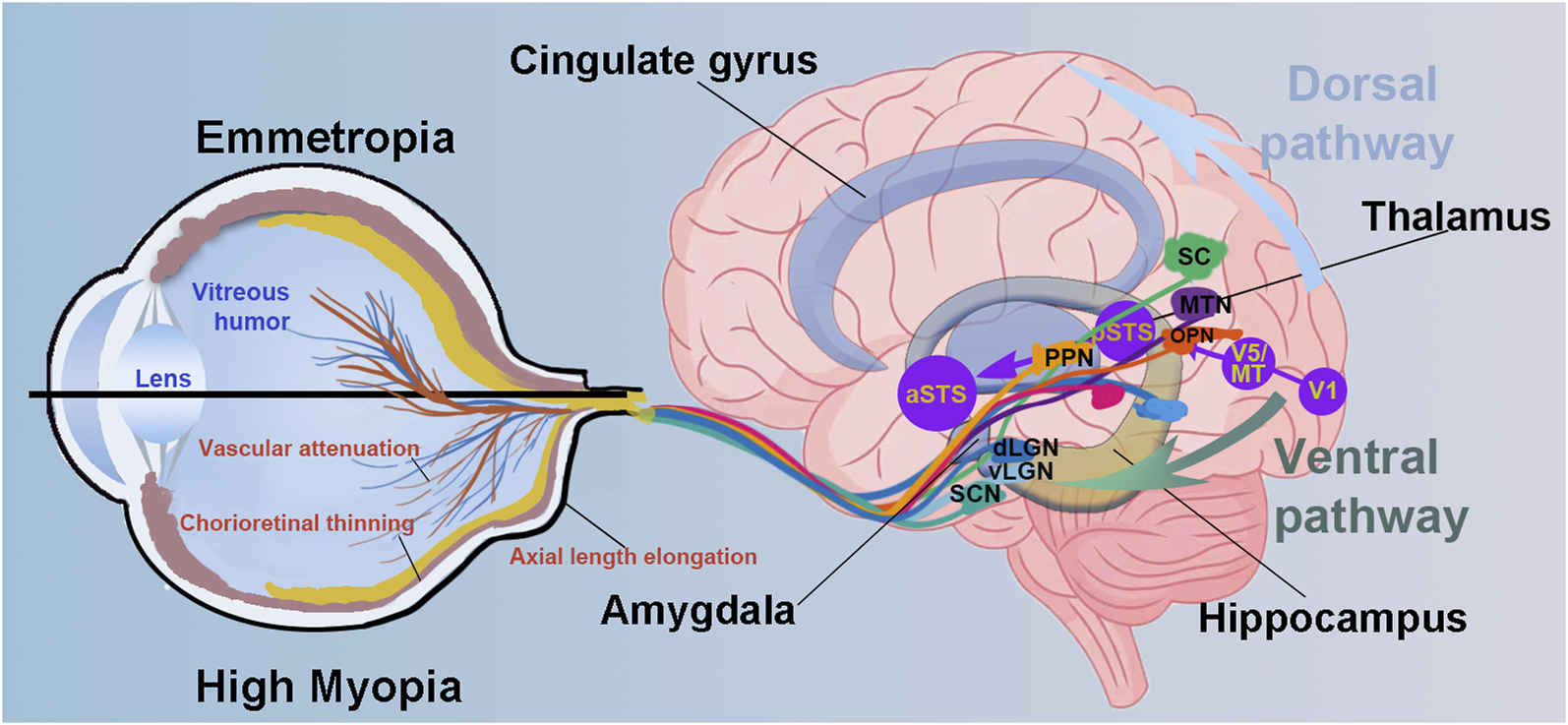 Schematic diagram illustrating eye–brain pathways and potential neural alterations associated with high myopia. Compared to emmetropic eyes, highly myopic eye presents the axial length elongation, chorioretinal thinning and atrophy and vascular attenuation. Visual information is transmitted via retinal ganglion cells to multiple subcortical and cortical regions through parallel pathways. The diagram emphasizes both the dorsal pathway (involved in spatial attention and visuomotor integration) and the ventral pathway (related to object recognition and emotional processing). Key visual and non-image-forming areas are also illustrated. Altered input from the retina in high myopia may disrupt downstream processing in these brain regions, associating with potential deficits in visual perception, cognition, and emotion. Suprachiasmatic nucleus, SCN; dorsal and ventral lateral geniculate nucleus, dLGN and vLGN; superior colliculus, SC; primary visual cortex, V1; pedunculopontine nucleus, PPN; olivary pretectal nucleus, OPN; medial terminal nucleus, MTN; middle temporal visual area, V5/MT; posterior superior temporal sulcus, pSTS and aSTS, posterior and anterior superior temporal sulcus.