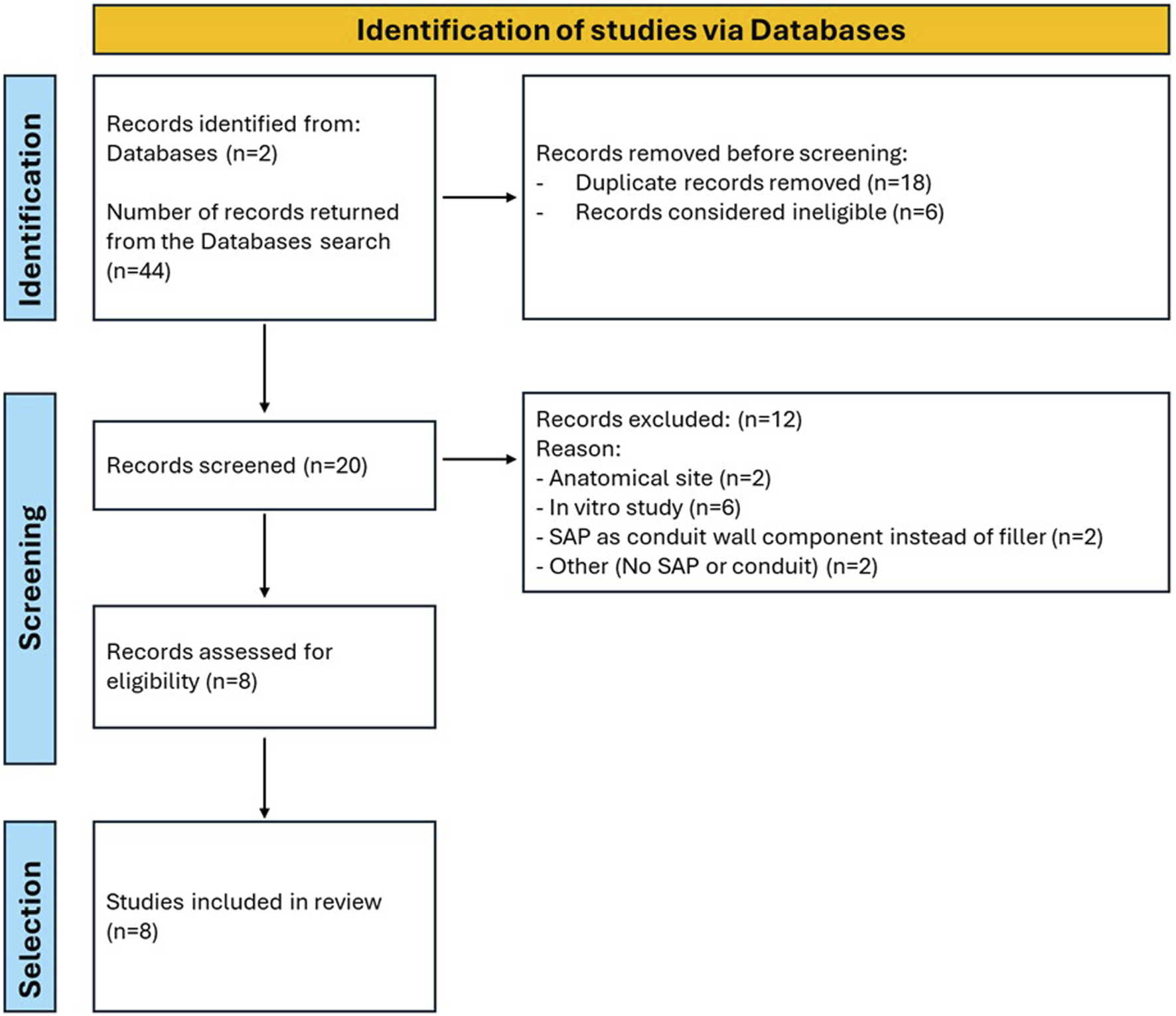 A preliminary query of the PubMed and Scopus databases revealed 17 and 27 studies from 2007 to 2025 (Figure 1). After an initial screening using the titles, the abstracts and methods, eight studies were found to meet our inclusion criteria. These eight studies in which SAPs were used as luminal fillers are reviewed in Supplementary Table 1. Studies on SAPs as luminal filler spanned from 2013 to 2022. Two studies focused on the SAP RADA 16-I; whereas, six studies focused on differently decorated RADA 16-I; both a single and a dual functionalization were considered.