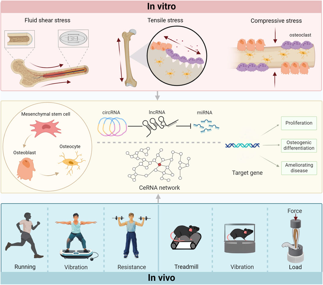 Figure 1. The force of contact regulates target genes by controlling the ceRNA network through various in vitrointervention modes and in vivoaction mechanisms, subsequently affecting the bones.