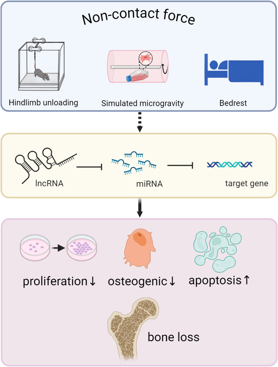 Figure 2. The non-contact force component alleviates the bone’s sensitivity to force via ncRNAs, ultimately resulting in bone loss.