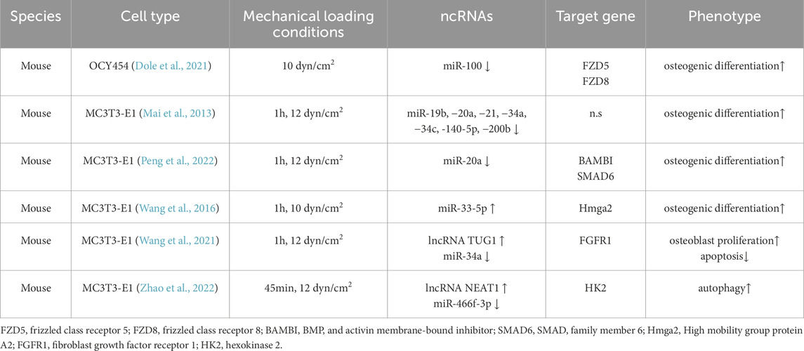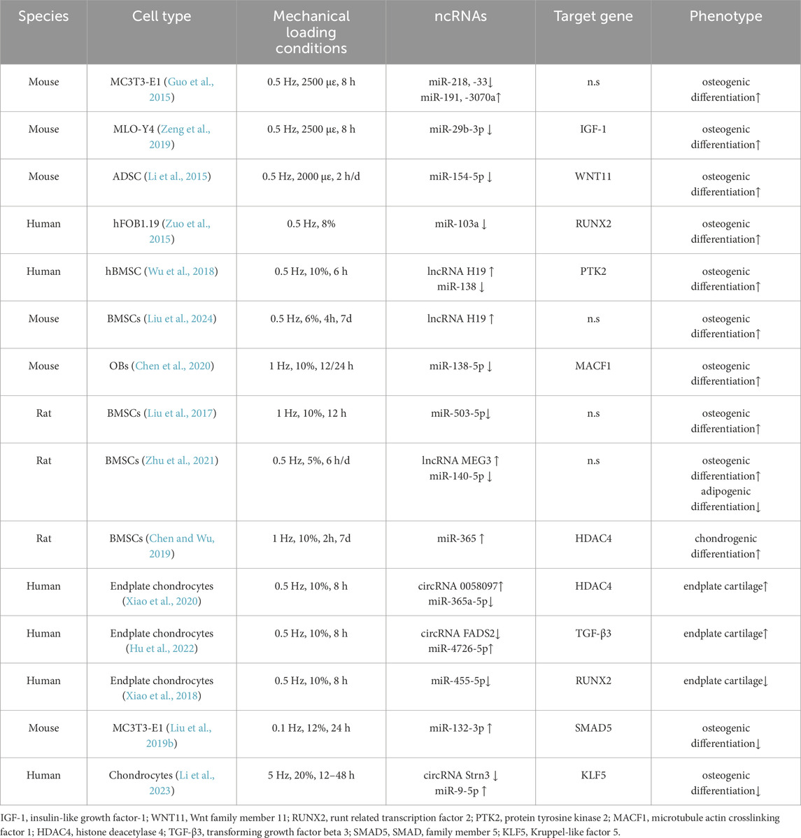 In contrast to the tension of tension, compressive force is the compression of an object, but it seems difficult to observe in rigid bones. Needless to say, one of the most important functions of bones is to provide support. Weight-bearing bones are constantly under the pressure of their own weight, which bones seem to have long been accustomed to. Perhaps because of this, more attention has been paid to the response of bones when they lose weight or are exposed to other mechanical stimuli, and the effects of compressive force on bones have been neglected. Studies have shown that compression is a rate-limiting process, and excessive pressure is detrimental to bone tissue. However, the controversial results of stress deserve in-depth exploration. Previous studies have shown that a pressure of 1.0 g/cm2 is the optimal condition for MC3T3-E1 osteogenic differentiation (Yanagisawa et al., 2008), and that osteogenic differentiation increases with increasing pressure (Tripuwabhrut et al., 2013), until the upper limit of the effect of pressure on cell viability (5.0 g/cm2) (Shen et al., 2017). Conversely, applying a compressive force of 3.0 g/cm2 (294 Pa) for 24 h slowed the growth of osteoblast MC3T3-E1 compared to the non-stressed group (Iwawaki et al., 2015). RT-qPCR after microarray analysis showed that compressive force increased the level of miR-494-3p, while inhibition of cell proliferation was attributed to a decrease in miR-494-3p′s direct target fibroblast growth factor receptor 2 (FGFR2) and Rho-associated coiled coil kinase 1 (ROCK1) (Iwawaki et al., 2015). However, osteogenic differentiation of MC3T3-E1 was inhibited by downregulating the expression of miR-494-3p in senescent MLO-Y4 osteocyte-derived exosomes (Yao C. et al., 2024). Although miR-494-3p targeted a number of other genes this time, these results show that regardless of miR-494-3p expression, it appears to be detrimental to osteogenesis. However, the expression of lncRNA PAGBC was increased by 100 psi hydrostatic pressure, and miR-133b was inhibited in the form of competitive endogenous RNA, thereby promoting osteogenic differentiation of adipose mesenchymal stem cells (AMSCs) by upregulating the expression of Runx2 (Ru et al., 2020).