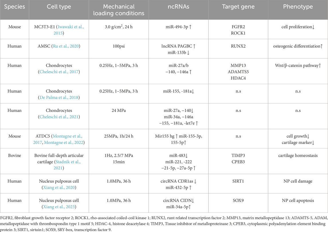 Due to the high water content of cartilage tissue (about 70%), the main loading stimulus sensed by chondrocytes embedded in the cartilage matrix is hydrostatic pressure (Sun, 2010; Liu S. et al., 2019), and the physiological range in the body is usually 0–10 MPa (Chen et al., 2013). It has been shown that the physiological circulatory load on articular cartilage is fundamental to the regulation of chondrocyte metabolic activity (Segarra-Queralt et al., 2024). Articular cartilage degeneration and periarticular and subchondral bone thickening are clinical features of osteoarthritis OA (Martel-Pelletier et al., 2016). To simulate the most common knee joint pressure (5 MPa) during normal gait (Guilak and Hung, 2005), Cheleschi et al. exposed chondrocytes from normal individuals and OA patients to circulating hydrostatic pressure (1–5 MPa, 0.25 Hz) for 3 h and collected cells at different time points within 48 h (Cheleschi et al., 2017). It was found that the expression levels of miR-27a/b, miR-140, and miR-146a were significantly increased in OA chondrocytes, and the Wnt/β-catenin pathway was activated by inhibiting their target genes (Cheleschi et al., 2017). Moderate HP induction plays a positive role in OA cells by restoring certain miRNA levels. Subsequently, the team also observed a significant increase in miR-155 and miR-181a in OA cells, but both were immediately downregulated under the same pressure protocol (De Palma et al., 2018), while high continuous HP (24 MPa) reversed the expression of miR-155 and miR-181a (Cheleschi et al., 2021). Previously, it was found that excessive pressure (25 MPa) induced changes in gene expression in mouse ATDC5 chondrocyte progenitor cells were similar to those observed in OA cartilage (Montagne et al., 2017). Excessive mechanical pressure can damage the extracellular matrix of chondrocytes and alter the balance of chondrocytes. Subsequently, in order to better characterize the effect of miR-155 on cartilage homeostasis, Montagne et al. (2022) subjected ATDC5 cells to 5 MPa, 10 MPa, and 25 MPa pressure. Unlike previous studies, they found that Mir155 hg was significantly upregulated only at high HP (25 MPa) after applying pressure for up to 48 h (Montagne et al., 2022). Mir155 hg is the host gene of miR-155 and belongs to a type of lncRNA. Importantly, Mir155 hg begins to upregulate as early as 1 h after pressurization and has since maintained a high level. However, upregulation of low abundance chain miR-155-3p and high abundance chain miR-155-5p processed from Mir155 hg is not significantly induced until at least 24 h later (Montagne et al., 2022). This may be attributed to the regulation and subcellular localization of lncRNA, as Mir155 hg is mainly localized within the nucleus (Montagne et al., 2022). In addition, the upregulation response induced by high HP seems to activate some membrane channels, further confirming previous views that HP may alter membrane fluidity or increase membrane bending stiffness to alter membrane forces, thereby triggering mechanical transduction and indirectly affecting the conformation and binding of signaling molecules (Montagne et al., 2014; Purushothaman et al., 2015). In addition, the abnormal compressive force regulates several miRNAs in the articular cartilage (Stadnik et al., 2021). In vitro, when bovine full-depth articular cartilage explants were loaded to 2.5 or 7 MPa (1 Hz, 15 min), it was observed that miR-221, miR-222, miR-21-5p, and miR-27a-5p were all higher than 2.5 MPa at 7 MPa, while miR-483 levels were opposite (Stadnik et al., 2021). These miRNAs regulate cartilage homeostasis by recognizing the magnitude of the load and inhibiting downstream targets. Based on previous views (≤6 MPa is usually accepted as physiological load) (Fehrenbacher et al., 2003), they believe that the compression force of 7 MPa exceeds the physiological range. Although this range is inconsistent with the previous description, it has to be admitted that the mechanical regulation under this “non-physiological” (7 MPa) is significantly better than the physiological 2.5 MPa. Therefore, the scoping of mechanical forces under physiological and non-physiological conditions still needs to be standardized among different species. In short, the maintenance of articular cartilage homeostasis depends on chondrocytes, and also depends on the regulation of mechanical load, especially under dynamic compressive force, the balance of its anabolic and catabolic activities is maintained so that the cartilage extracellular matrix is in a constant state of renewal to adapt to the moderate mechanical load challenge, which has a certain preventive and slowing effect on the occurrence and development of osteoarthritis.