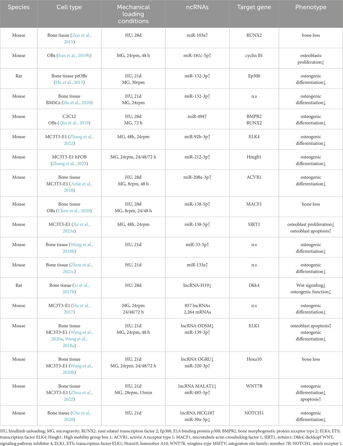 In contrast to mechanical loading, unloading is a form of non-contact force. The unloading of bones can cause severe disuse osteoporosis, one of the main problems of bone health. This condition is common in astronauts on long-term space flights as well as in bedridden patients. Given the high cost of aerospace research and the mobility of bedridden patients, researchers have developed a variety of forms of microgravity simulation to explore the mechanical microenvironment. In animals, the hindlimb unloading (HU) model is a well-tolerated method and has been widely used to simulate the removal of bone bearing in space (Morey-Holton and Globus, 1998; Morey-Holton and Globus, 1985; Globus and Morey-Holton, 1985). Because microgravity not only promotes the catabolism of bones (Nabavi et al., 2011; Coulombe et al., 2020), but also impairs the adaptation of the cytoskeleton to mechanical stimuli. As an important factor in the load-bearing structure and mechanical transduction of cells, the cytoskeleton is particularly sensitive to external stimuli, especially changes in gravity (Qin et al., 2020; Klein-Nulend et al., 2012; Wu et al., 2022). This suggests that the inhibition of osteogenic differentiation in microgravity is partly caused by the loss of mechanical transduction ability, which may explain the occurrence of unload-induced osteoporosis and other diseases. In vitro, the use of clinostats, such as the Random Positioning Machine (RPM) or the Rotating Wall Vessel (RWV), simulates space weightlessness by continuously rotating around a horizontal axis to produce a vector weightlessness that prevents the cell from feeling gravity (Patel et al., 2007; Rauh et al., 2011). The sensitivity of osteoblasts and mesenchymal stem cells to mechanistic cues highlights the importance of clonal proliferation and osteogenic differentiation in preventing load-induced osteopenia and bone microstructural deterioration (Lee et al., 2017). As more and more ncRNAs are found to be involved in and regulate a variety of bone pathological processes, especially the role of miRNAs that maintain a well-conserved type among different species and the role of the ceRNA network mechanism formed by lncRNA and miRNA in the process of transcription or regulatory factors involved in osteogenic differentiation. Importantly, these ncRNAs are also involved in the transduction pathway of osteogenic differentiation and bone formation guided by mechanical stimulation. This underlines the stifling effect of mechanical loading on phenomena such as osteoporosis.