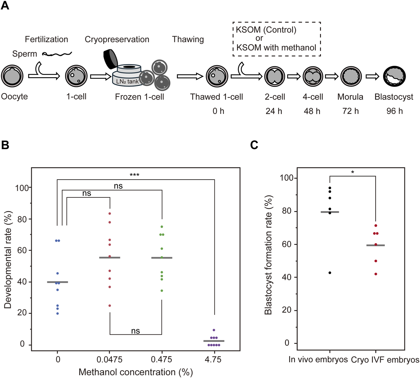 Figure 1. Optimization of methanol concentration for inhibitor library screening using mouse embryos. (A) Schematic workflow for testing methanol toxicity in mouse embryos. (B) Developmental rates of mouse embryos cultured for 96 h in KSOM medium containing methanol at various concentrations: 0% (control), 4.75% (standard final concentration from the stock solution), 0.475%, and 0.0475%. Embryo development was severely impaired at 4.75% methanol, whereas no significant differences were observed between the control and lower concentrations (0.475% and 0.0475%). Statistical analysis was performed using the Tukey-Kramer test (n = 3). (C) Blastocyst formation rates in embryos fertilized in vivo after natural mating (In vivo embryos) versus embryos generated by in vitro fertilization and subsequently cryopreserved (Cryo IVF embryos). Statistical analysis was performed using the t-test (n = 6). Data are presented as mean ± SD. ***p < 0.0001; *p < 0.05; n. s., not significant.