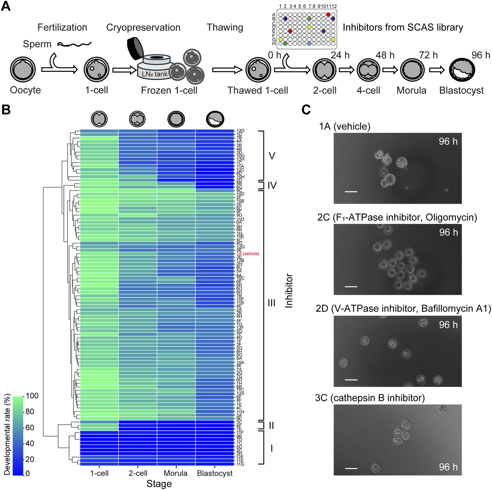 Figure 2. Screening of inhibitor libraries identified stage-specific regulators of early mouse embryonic development. (A) Schematic overview of the screening strategy using ultra-superovulation, in vitro fertilization, and one-cell embryo cryopreservation to ensure genetic uniformity across experimental groups. (B) Heatmap showing developmental outcomes of embryos cultured with 95 different inhibitors. Compounds were grouped by hierarchical clustering based on their stage-specific effects: Group I (lethal at one-cell stage), Group II (block at 1-cell to 2-cell), Group III (no effect), Group IV (block at blastocyst formation), and Group V (block at 4-cell to morula transition). Color scale represents the percentage of embryos reaching each developmental stage at 96 h, with blue indicating low and green indicating high developmental rates. (C) Representative developmental outcomes for selected known inhibitors. Scale bar = 100 μm.