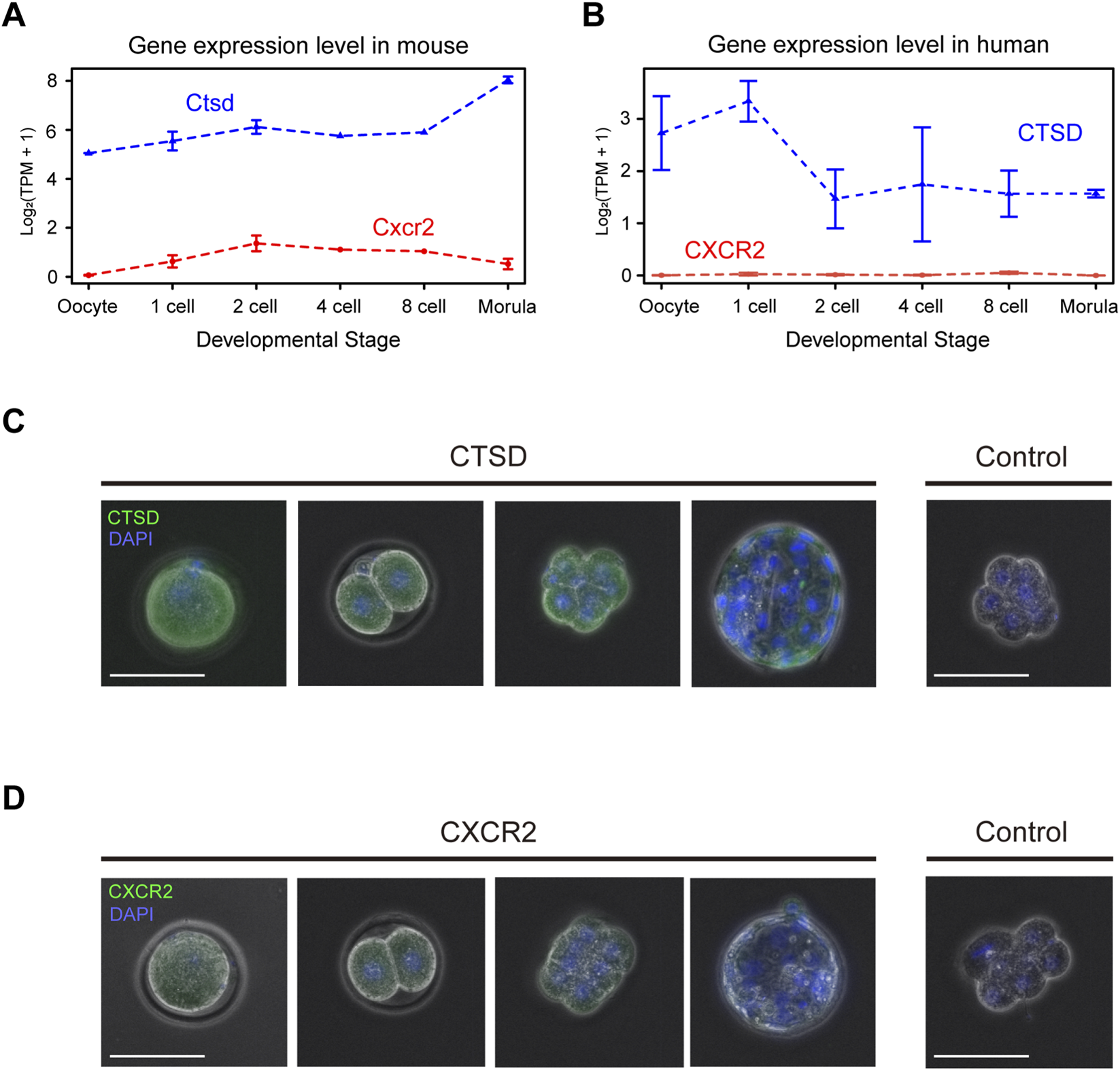 Figure 3. Cathepsin D (Ctsd) and Cxcr2 genes are expressed in mouse embryo. (A) Expression level of Ctsd, and Cxcr2 by developmental stage in mice. The RNA-seq data from oocyte to morula stage mouse embryo in public database is reanalyzed. Each line indicates the expression level calculated by log2(TPM+1) values. (B) Expression level of CTSD, and CXCR2 by developmental stage in human. The RNA-seq data from oocyte to morula stage mouse embryo in public database is reanalyzed. Each line indicates the expression level calculated by log2(TPM+1) values. (C) Immunofluorescence staining of Ctsd protein (CTSD) from MII stage oocyte to blastocyst stage embryo. Green indicates CTSD, and blue indicates DAPI The right panel shows the result using a negative control antibody instead of the anti-CTSD antibody. Size bars: 100 µm. (D) Immunofluorescence staining of Cxcr2 protein (CXCR2) from MII stage oocyte to blastocyst stage embryo. Green indicates CXCR2, and blue indicates DAPI The right panel shows the result using a negative control antibody instead of the anti-CXCR2 antibody. Size bars: 100 µm.