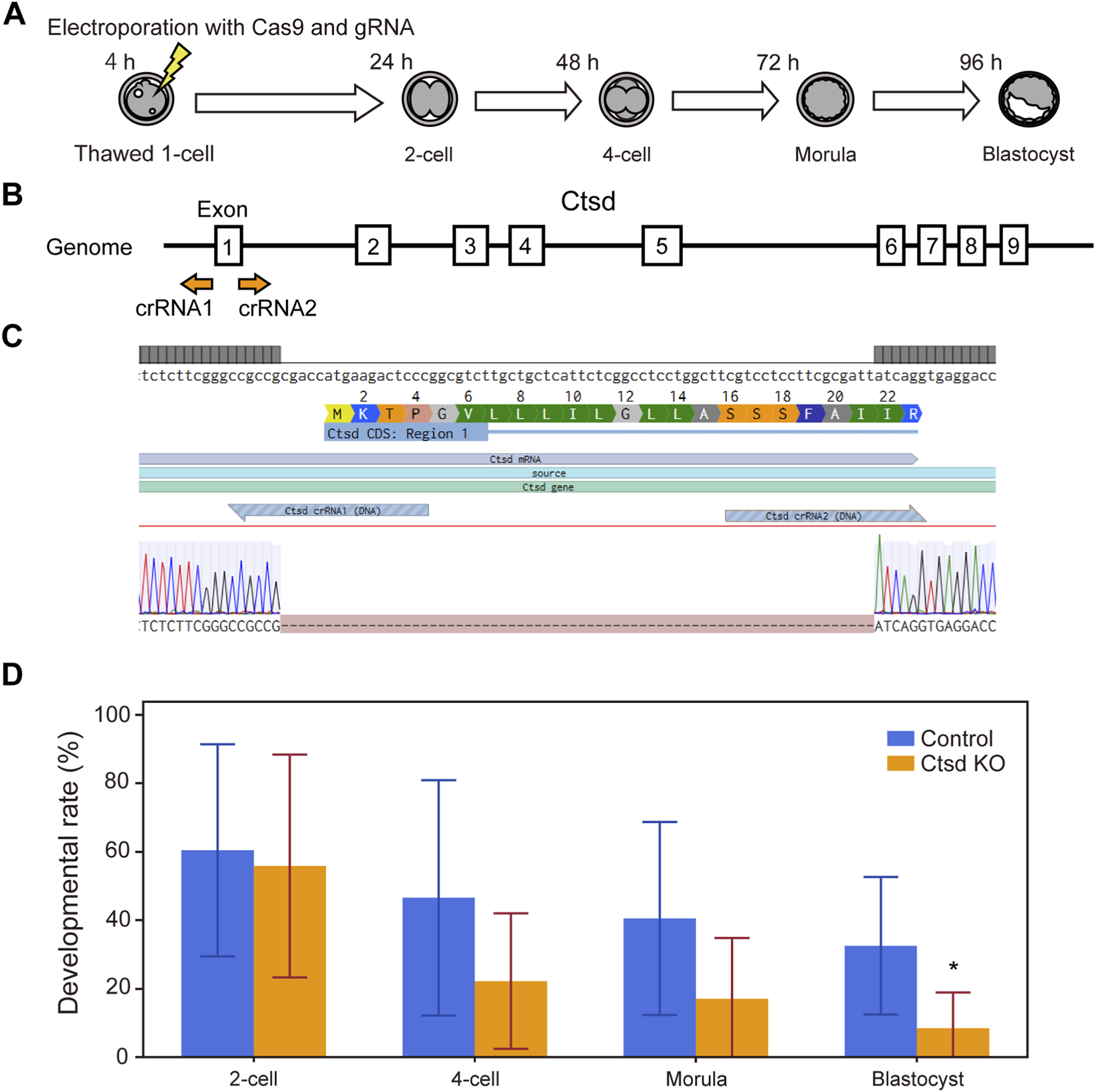 Figure 4. CRISPR-Cas9 mediated knockout of Ctsd genes in mouse embryos impairs preimplantation development. (A) Experimental workflow for CRISPR-Cas9 mediated gene knockout in one-cell stage embryos via electroporation. (B) Schematic of the Ctsd gene structure. Guide RNAs were designed to target the start codon in exon 1, which is shared across all splicing isoforms. (C) DNA sequences of the wild type (upper) and the knockout embryo (lower). Dashes (−) indicate nucleotides missing from the original target sequence. (D) Developmental outcomes of Ctsd knockout embryos. Data are presented as mean ± SD from three independent experiments. Statistical analysis was performed using the t-test. *p < 0.05.