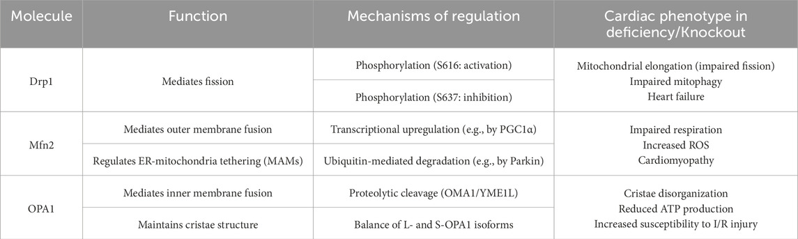 A reduction in OPA1 levels has numerous adverse consequences, attributable to the multifaceted roles of OPA1. This reduction can result in compromised mitochondrial fusion and cristae architecture, heightened vulnerability to apoptosis, respiratory dysfunction, and excessive ROS production (Pernas and Scorrano, 2016). In the absence of OPA1, OMMs can still undergo fusion, but IMMs cannot, leading to metabolic disturbances and preventing mixing of matrix contents between mitochondria (Nyenhuis et al., 2023). In Drosophila, OPA1 silencing in cardiac tissue results in cardiac dysfunction, mitochondrial depolarization, and increased ROS production (Dorn et al., 2011). In mice, both constitutive and tissue-specific ablation of OPA1 is embryonically lethal, while heterozygous OPA1 ± mice exhibit late-onset cardiac dysfunction at 1 year of age, characterized by reduced heart size and function. These mice exhibit small, fragmented mitochondria with damaged cristae. Furthermore, mitochondrial density is reduced, and their arrangement between myofilaments is disorganized. These defects culminate in impaired cardiac mitochondrial function and reduced ATP production. Additionally, they exhibit a decreased mtDNA copy number and may eventually develop blindness (Huang et al., 2017). The concomitant increase in ROS renders the myocardium more susceptible to I/R injury. Nonetheless, some studies reported no significant increase in apoptosis or cardiomyocyte loss in these heterozygous OPA1 ± mice.