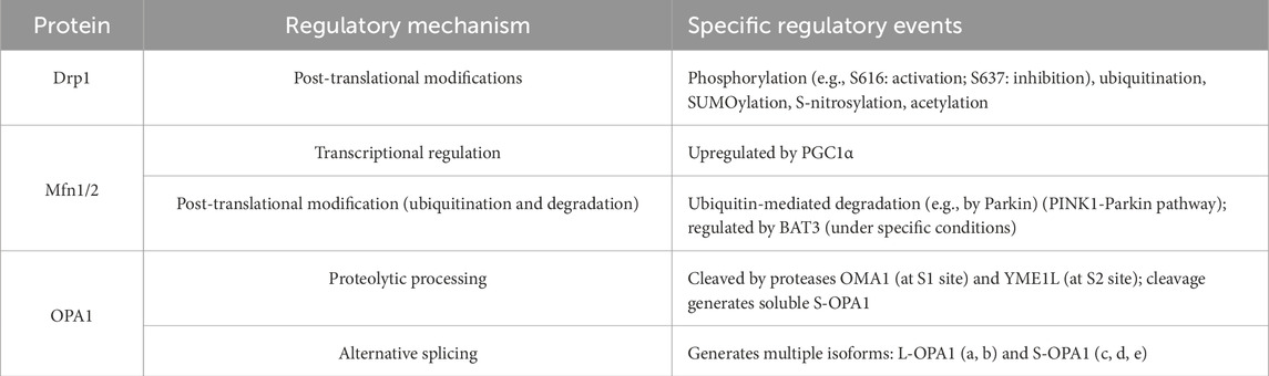 Mitochondrial dynamics involve numerous critical molecules, each responsible for regulating distinct processes. This chapter primarily elucidates the specific roles, activation, and regulatory mechanisms of four key molecules: Drp1, Mitofusin-1, Mitofusin-2, and OPA1. Table 1 provides a summary of the functions and regulatory pathways of these core kinetic proteins. Table 2 provides a summary of molecular regulatory mechanisms of key proteins in mitochondrial dynamics.