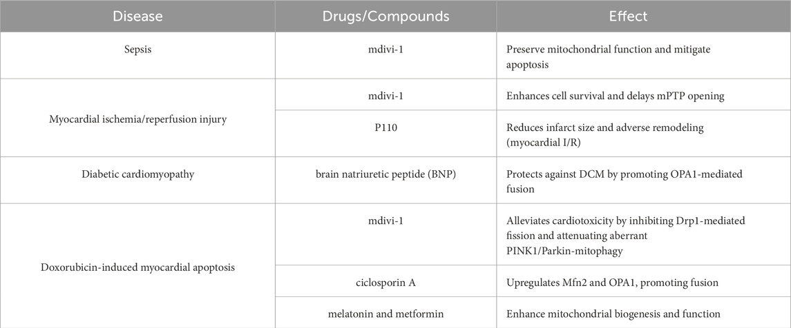 Recent research has increasingly focused on mitochondrial quality control systems as potential therapeutic targets to mitigate DOX-induced cardiotoxicity. Mdivi-1 alleviates DOX-induced cardiotoxicity by inhibiting Drp1 phosphorylation and mitochondrial fission (Gharanei et al., 2013). It also attenuates DOX-induced overactivation of PINK1/Parkin-mediated mitophagy, potentially contributing to the preservation of mitochondrial mass and function (Yin et al., 2018). Furthermore, cyclosporine A contributes to the maintenance of mitochondrial fusion by upregulating Mfn2 and OPA1 (Marechal et al., 2011). Additionally, melatonin and metformin, both widely used clinically, can enhance mitochondrial biogenesis by preserving mitochondrial function and homeostasis (Arinno et al., 2021). Furthermore, the function of the novel MTFP1 in doxorubicin (DOX)-induced cardiotoxicity remains unclear. However, studies have demonstrated that knockdown of Mtfp1 can reduce cardiomyocyte loss associated with DOX-induced cardiotoxicity. Consequently, modulating MTFP1 expression may represent a novel therapeutic strategy for managing chemotherapy-induced cardiotoxicity (Aung et al., 2017). Table 3 provides a summary of the role of mitochondrial quality control drugs in cardiovascular disease models.
