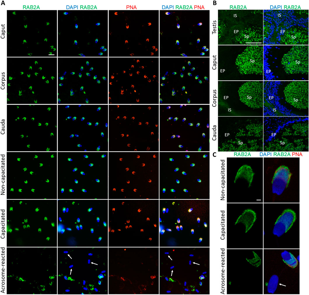 Figure 1. Visualization of RAB2A protein in boar spermatozoa and reproductive tissue sections. (A) Fluorescent signal of anti-RAB2A/5C5 antibody (green) was detected by epifluorescence microscopy in the acrosome of spermatozoa isolated from the caput, corpus, and cauda epididymis. Acrosomes were stained with lectin PNA (red), and DNA was stained with DAPI (blue). Fluorescent signal of the anti-RAB2A/5C5 antibody (green) was detected by epifluorescent microscopy in the acrosomes of non-capacitated and in vitro capacitated spermatozoa. No signal was detected in the spermatozoa that have undergone the acrosome reaction (white arrows). Acrosomes were stained with lectin PNA (red), and DNA was counter-stained with DAPI (blue). The scale bar represents 10 µm. Negative controls are shown in Supplementary Figure S4. (B) Fluorescent visualization of RAB2A in the testicular sections revealed a strong fluorescent signal in the acrosomes of sperm cells in the lumen. The signal remained strong in the acrosomes of spermatozoa in the lumen of the caput, corpus, and cauda epididymis. Sp, spermatozoa; EP, epithelial cells; IS, interstitial tissue. The scale bar represents 100 µm. Negative controls are shown in Supplementary Figures S6, S7. (C) High-resolution images of RAB2A localization in non-capacitated, in vitro capacitated, and acrosome-reacted (white arrow) spermatozoa obtained by confocal microscopy. The scale bar represents 1 µm.