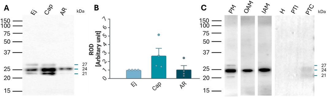 Figure 2. Detection and localization of RAB2A protein in boar spermatozoa. (A) RAB2A (5C5) antibody detected the 21, 24, and 27 kDa protein bands by Western blot analysis. All three forms were detected in the non-capacitated (ejaculated; Ej) and capacitated (Cap) spermatozoa, while the acrosome-reacted (AR) spermatozoa contained mainly the 24 kDa isoform. Each lane was loaded with protein extracted from 5 × 106 sperm cells. (B) Densitometric analysis of the total signal did not show significant (p > 0.05) differences in RAB2A content between Ej, Cap, and AR spermatozoa. (C) Further analysis showed that the 21 and 27 kDa forms were mainly located in the sperm plasma membrane (PM) enriched fraction, while the 24 kDa isoform was present in all sperm membrane fractions, including the enriched PM, the outer acrosomal membrane (OAM), and the inner acrosomal membrane (IAM) proteins, which contain also the sperm head residual proteins. The RAB2A also contributed to the proteome of PT, namely the 21 and 24 kDa forms, which were detected in covalently-bound proteins of perinuclear theca (PTC) protein fractions. Rest of the head (H), ionically-bound proteins of the perinuclear theca (PTI). Membrane fractionation was verified by fluorescent lectin labeling of the acrosome using PNA lectin (Supplementary Figure S5B).