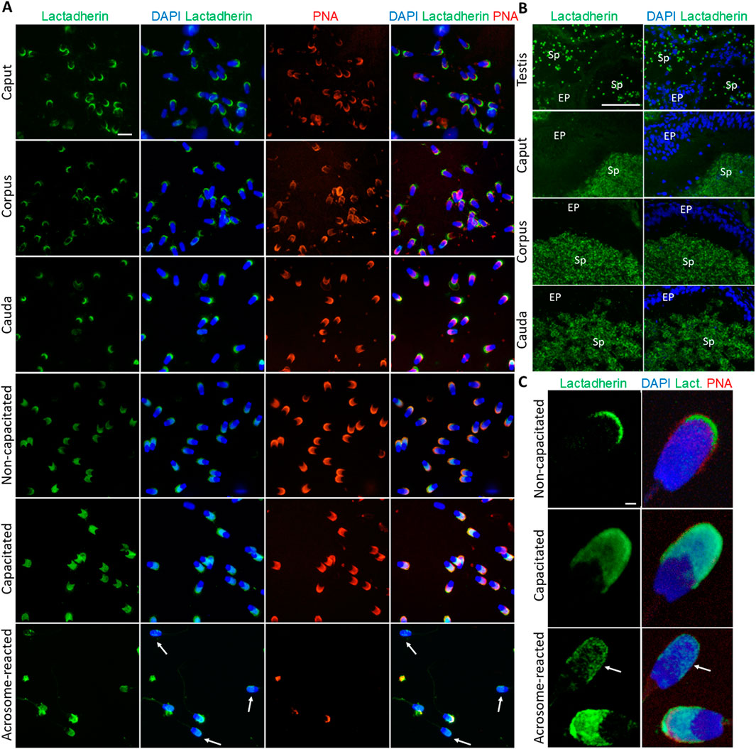 Figure 3. Visualization of lactadherin/MFGE8 in boar spermatozoa and reproductive tissue sections. (A) Fluorescent signal of anti-lactadherin antibody (1H9-green) was detected by epifluorescence microscopy in the apical ridge of the acrosome in spermatozoa isolated from the caput, corpus, and cauda epididymis. Acrosomes were stained with lectin PNA (red), and DNA was stained with DAPI (blue). Fluorescent signal of the anti-lactadherin antibody (green) was detected in the apical region of the acrosome of non-capacitated spermatozoa, and across the entire acrosome of the in vitro capacitated spermatozoa. A weaker signal was detected in the spermatozoa that have undergone the acrosome reaction (white arrows). Acrosomes were stained with lectin PNA (red), and DNA was stained with DAPI (blue). The scale bar represents 10 µm. Negative controls are shown in Supplementary Figure S6. (B) Fluorescent visualization of lactadherin/MFGE8 in the testicular section revealed a strong fluorescent signal in the apical ridge of the acrosomes in the lumen, and a weak signal in the surrounding tissue. The signal remained strong in the acrosomes of sperm cells in the lumen of the caput, corpus, and cauda epididymis. Sp, spermatozoa; EP, epithelial cells. The scale bar represents 100 µm. Negative controls are shown in Supplementary Figures S6, S7. (C) For better resolution, detailed images obtained by confocal microscopy display non-capacitated, in vitro capacitated, and acrosome-reacted (white arrow) spermatozoa. The scale bar represents 1 µm.