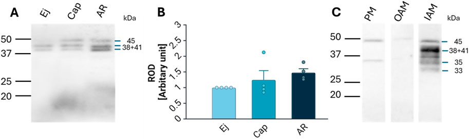 Lactadherin/MFGE8 was also detected by Western blot analysis as three main isoforms, at 38, 41, and 45 kDa, in Ej, Cap, and AR spermatozoa (Figure 4A), with no significant differences observed (Figure 4B). Further sperm membrane fractionation revealed that 35 and 45 kDa lactadherin/MFGE8 isoforms were present in the PM and OAM enriched fractions. The IAM fraction, containing also the sperm head residues, displayed these two isoforms, as well as the 33, 38, and 41 kDa forms of lactadherin/MFGE8 (Figure 4C).