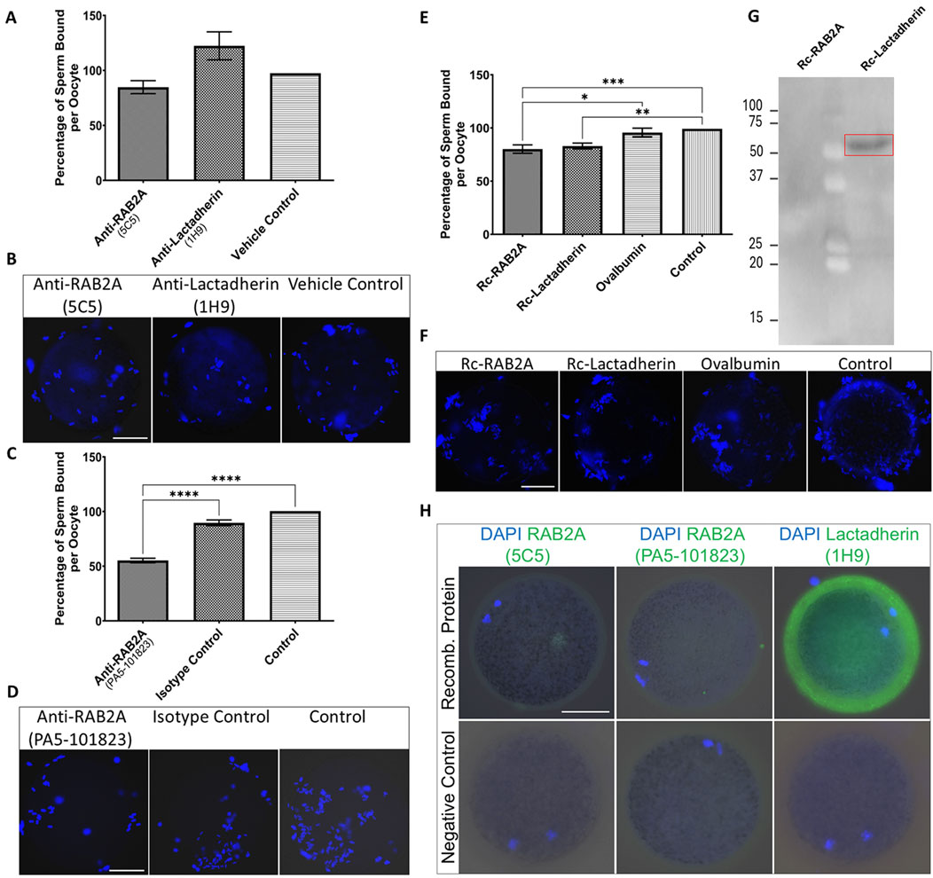 Figure 5. Evaluation of the number of spermatozoa bound to the ZP-intact oocytes in the in vitro binding assays. (A) The number of bound spermatozoa was non-significantly different in the anti-RAB2A (5C5, N = 40) and anti-lactadherin/MGFE8 (1H9, N = 38) groups compared to vehicle control (N = 46). (B) Representative images of DAPI-stained zona-bound spermatozoa in each group. (C) A significant reduction (***p < 0.001) in the number of zona-bound spermatozoa was observed in the commercial anti-RAB2A antibody group (PA5-101823, N = 55) compared to the isotype control (N = 51) and control without antibodies (N = 54). (D) Representative images of DAPI-stained zona-bound spermatozoa in each group. (E) A significant reduction in the number of zona-bound spermatozoa was observed in the recombinant RAB2A (N = 63) and rc-lactadherin (N = 61) groups, and no significant reduction in the ovalbumin group (N = 62), compared to the control without proteins (N = 61). (F) Representative images of DAPI-stained zona-bound spermatozoa in each treatment group; ***p < 0.001; **p < 0.01; *p < 0.05. (G) Western blot analysis of recombinant RAB2A and lactadherin/MGFE8 incubated with solubilized biotinylated ZP glycoproteins revealed a positive detection signal around 50 kDa, indicating that recombinant lactadherin/MGFE8 binds to the ZP glycoproteins. No signal was observed with the recombinant RAB2A. (H) Visualization of the attachment of the recombinant RAB2A to the ZP of the oocytes by using both anti-RAB2A antibodies (5C5 and PA5-101823) showed only a very weak fluorescent signal. In contrast, the anti-lactadherin antibody (1H9) showed a strong fluorescent signal in the oocytes co-incubated with rc-lactadherin. Negative controls showed no fluorescent signal. The scale bar represents 50 µm.