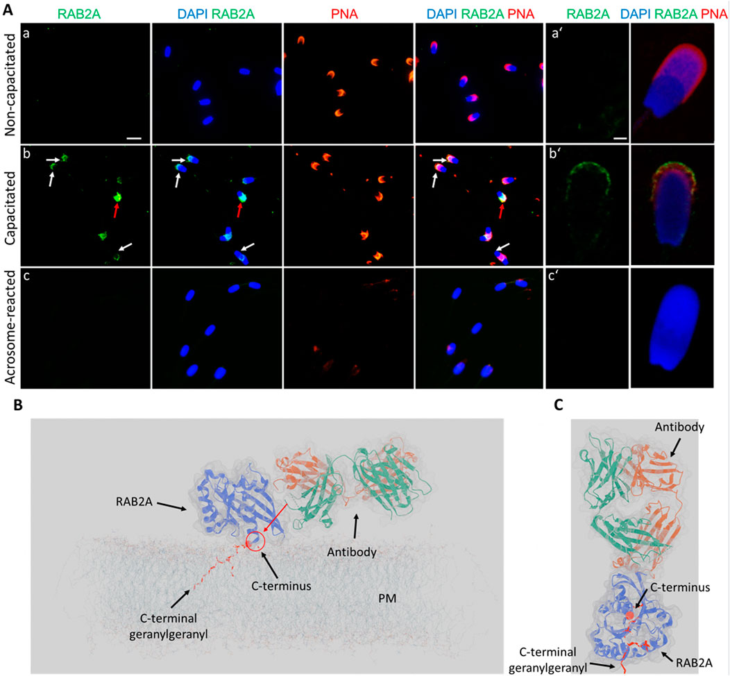 Figure 6. Visualization of RAB2A in non-permeabilized boar spermatozoa. (A) Fluorescent signal of the anti-RAB2A antibody (5C5-green) was not detected in the non-capacitated spermatozoa prepared in suspension; however, it was detectable in the apical acrosomal region of capacitated spermatozoa (white arrows). The red arrow indicates a stronger signal in the entire acrosome of a damaged sperm cell. No signal was detected in spermatozoa undergoing the acrosome reaction. Acrosomes were counter-stained with lectin PNA (red) and DNA with DAPI (blue). The scale bar represents 10 µm. (B) High-resolution images were obtained by confocal microscopy. The scale bar represents 1 µm. (C) Modeling of the differential epitope accessibility and interaction between the C-terminal domain of RAB2A and anti-RAB2A antibody. The red arrow indicates the inaccessibility of a potential epitope for antibody binding. (D) Modeling of the antibody orientation toward RAB2A. The C-terminal domain is indicated by the red sphere, and the lipid anchor by the red ribbon. A corresponding 3D video is available as Supplementary Video file. Negative controls are shown in Supplementary Figure S11.