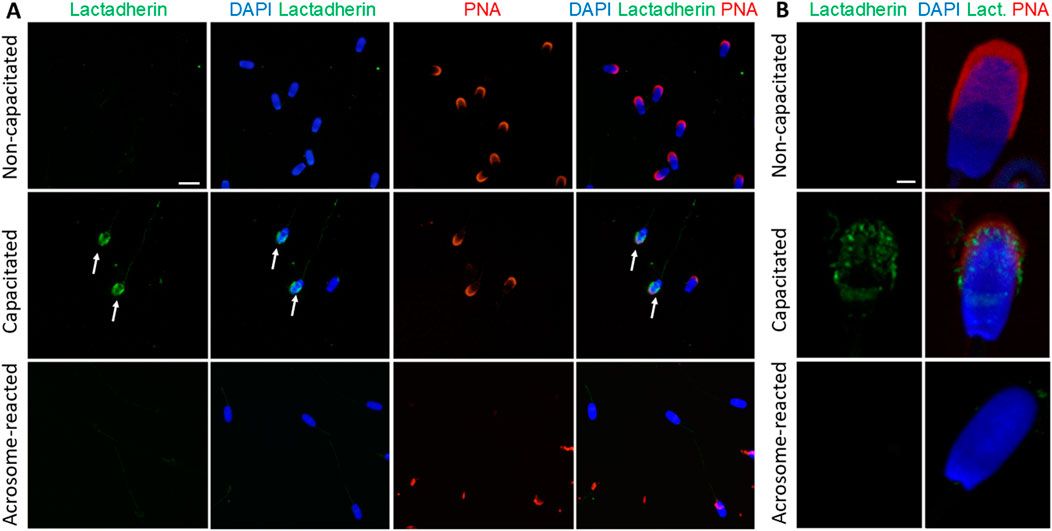 Figure 7. Visualization of lactadherin/MFGE8 in non-permeabilized boar spermatozoa. (A) Fluorescent signal of the anti-lactadherin antibody (1H9-green) was not detected in the non-capacitated spermatozoa, while it was prominent in the acrosomes of capacitated spermatozoa (white arrows). No visible signal was observed in the acrosome-reacted spermatozoa. Acrosomes were counter-stained with lectin PNA (red) and DNA with DAPI (blue). The scale bar represents 10 µm. (B) High-resolution images were obtained by confocal microscopy. The scale bar represents 1 µm. Negative controls are shown in Supplementary Figure S11.