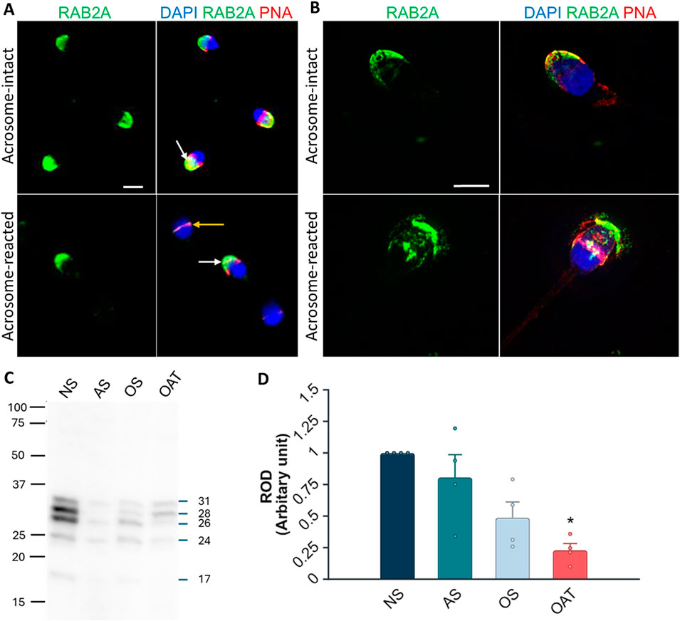 Figure 8. Localization and detection of RAB2A in human spermatozoa. (A) Fluorescent signal of the anti-RAB2A antibody (5C5-green) was detected by epifluorescent microscopy in the acrosome-intact spermatozoa fixed with paraformaldehyde (white arrow); however, the fluorescent signal was absent from the apical region of acrosome-reacted spermatozoa (yellow arrow). (B) Fluorescent signal of the anti-RAB2A was also detected by SIM in acrosome-intact human spermatozoa, and disrupted by acrosomal exocytosis (red), causing the loosening/release of RAB2A from spermatozoa (green). The presence of acrosomes was confirmed with lectin PNA (red), and DNA was counter-stained with DAPI/Hoechst 33342 (blue). The scale bar represents 3 µm. (C) The RAB2A protein (31, 28, 26, 24, 17 kDa) was detected in the normozoospermic (NS), asthenozoospermic (AS), oligozoospermic (OS), and oligoasthenoteratozoospermic (OAT) sperm lysates. Each lane was loaded with protein extracted from 5 × 106 sperm cells. (D) Relative optical density (ROD) confirmed a decreased RAB2A protein content in spermatozoa from men with specific etiologies of male infertility (N = 4), with a significant reduction observed in OAT samples in comparison to normospermic samples (**p < 0.01).