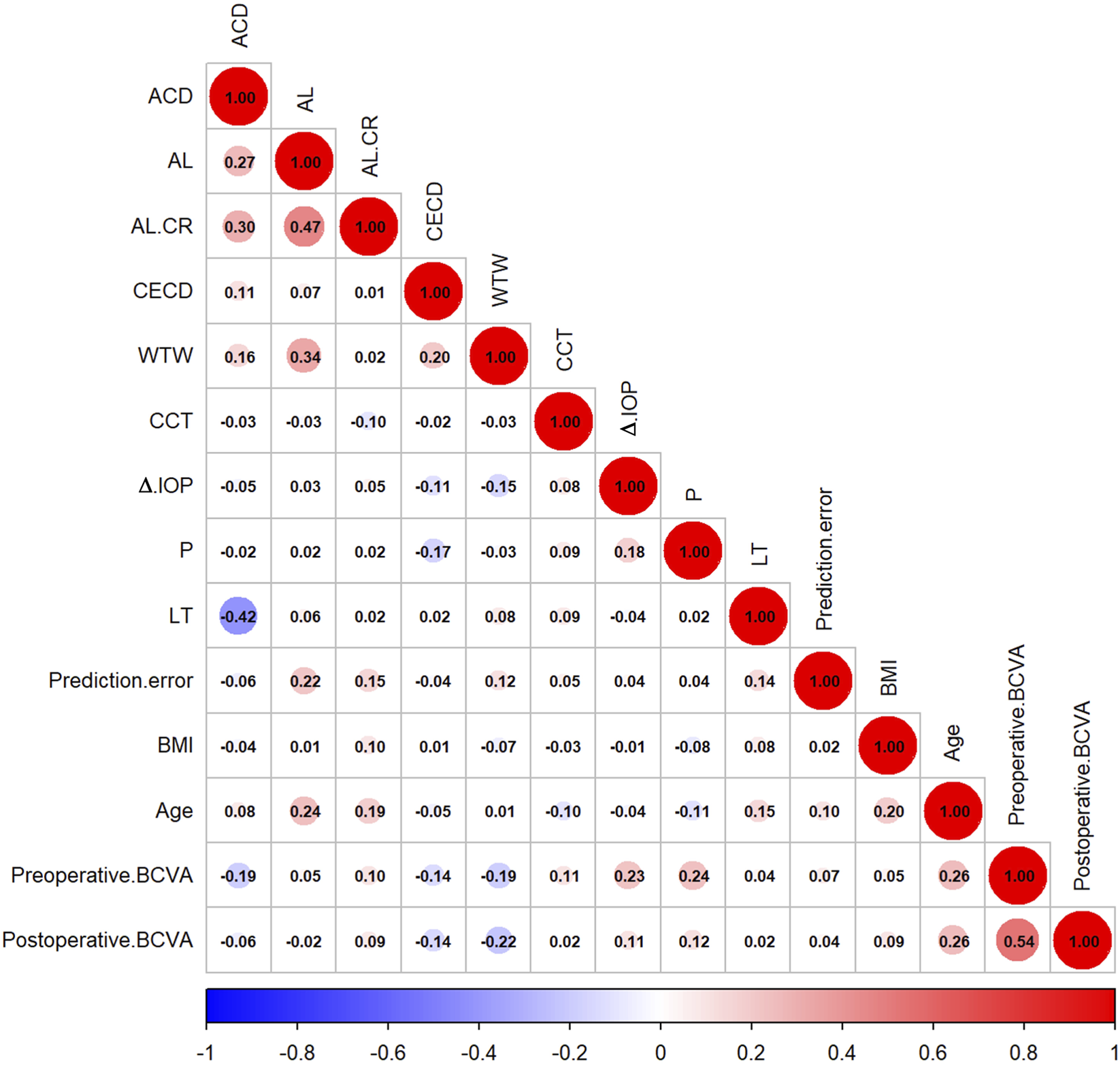 ACD, Anterior chamber depth; AL, Axial length; AL/CR, Axial length/corneal radius; BCVA, Best-corrected visual acuity; BMI, Body mass index; CCT, Central corneal thickness; CECD, Corneal endothelial cell density; CTR, Capsular tension ring; GSL, Goniosynechialysis; IOP, Intraocular pressure; K1, Flat Axis Curvature; K2, Steep Axis Curvature; LT, Lens thickness; P, Pupil diameter; WTW, White-to-White Distance.