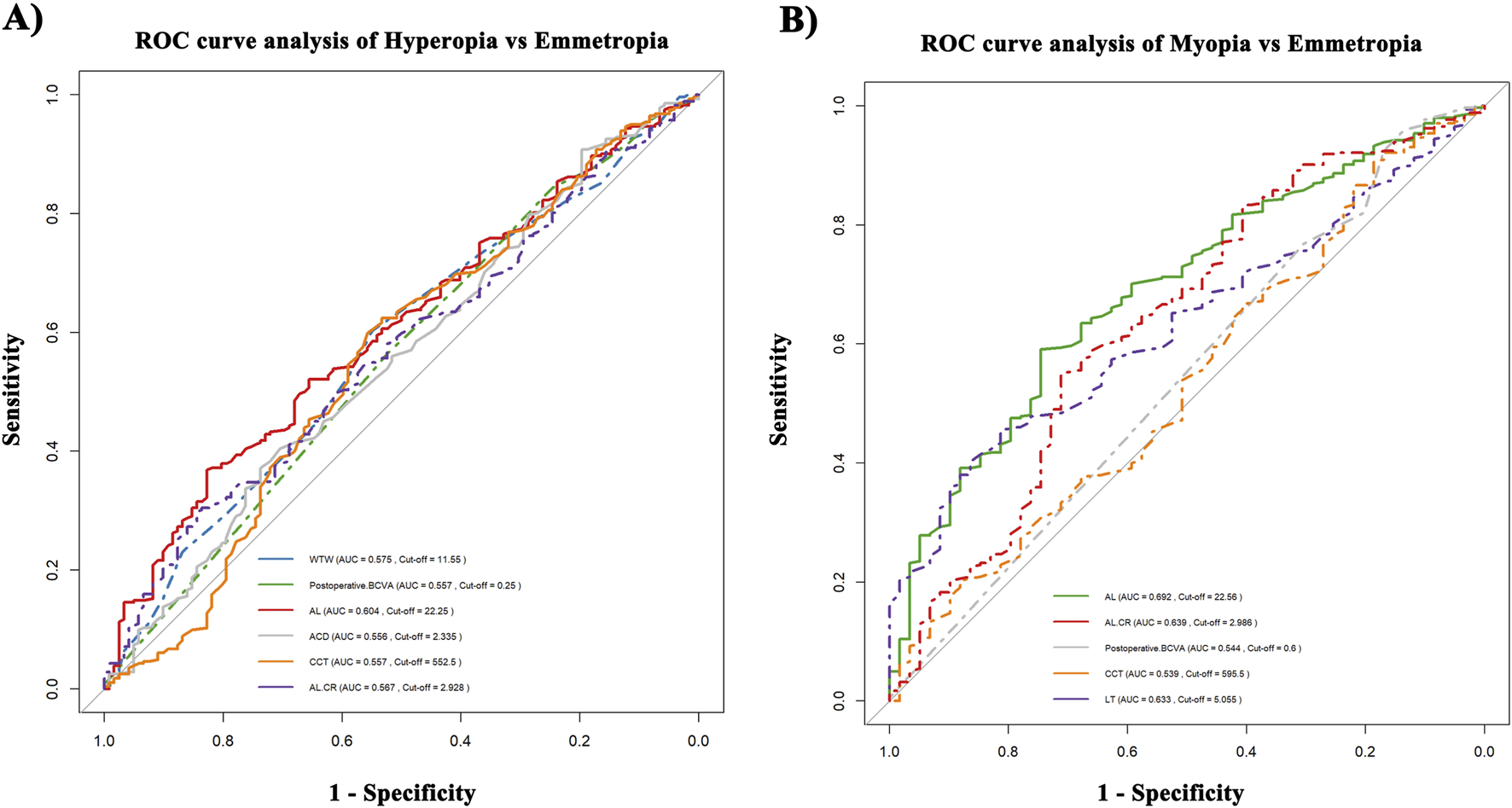 Axial length (AL), lens thickness (LT), and white-to-white distance (WTW) were key predictive factors for prediction error and postoperative refractive outcomes. AL > 22.56 mm (AUC = 0.692) and LT > 5.055 mm (AUC = 0.633) increased the risk of myopic shift (MS), while AL < 22.25 mm (AUC = 0.604) and WTW <11.55 mm (OR = 2.209, P = 0.001) were associated with hyperopic shift (HS). The axial length/corneal radius (AL/CR) ratio >2.986 further indicated a higher risk of MS (AUC = 0.639) postoperatively. Among patients who underwent PE + IOL combined with capsular tension ring, the proportion of HS was significantly higher (Z value = +2.95).