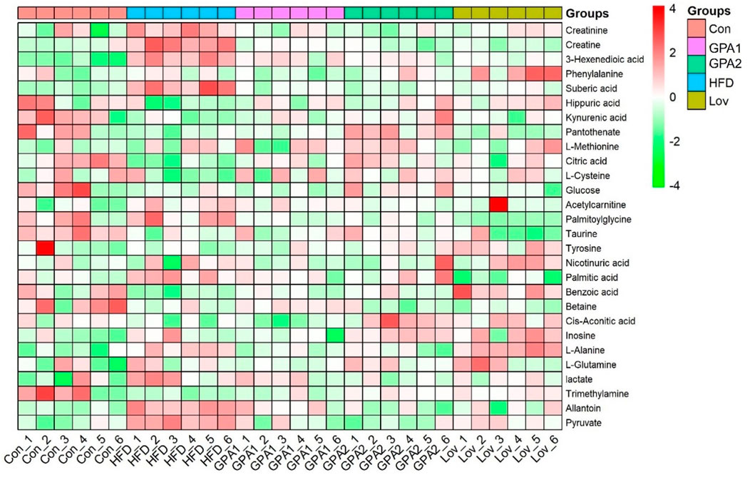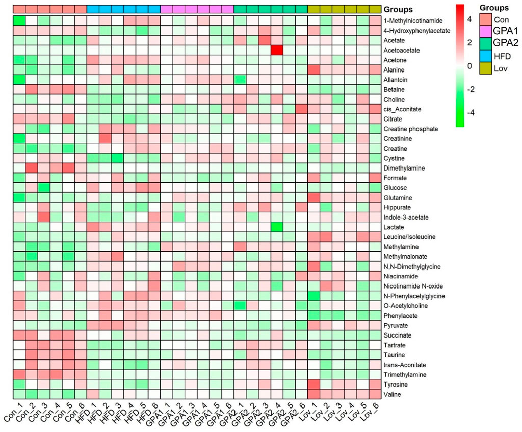 According to serum biochemistry and metabolomic analyses, lovastatin treatment exhibits a significant antihyperlipidemic effect. However, metabolomic analysis revealed additional details. According to the OPLS-DA analysis between the Lov and HFD groups, the metabolic pathways disturbed by HFD induction were partially recovered. By the S-plot, the leucine and isoleucine levels were increased, indicating enhanced synthesis of ketogenesis amino acid by lovastatin; the acetate level were increased significantly, suggesting excretion of the excess amount of acetyl-CoA by β-oxidation by lovastatin; meanwhile, the citrate level was increased, inferring an upregulated TCA cycle; furthermore, urine levels of acetoacetate were increased, indicating enhanced ketone bodies synthesis under lovastatin treatment. However, when inspecting metabolic regulation of GPA (300 mg/kg), it was revealed that urine’s leucine and isoleucine levels were decreased, suggesting suppressed ketogenic amino acid synthesis; urine’s lactate levels were reduced, indicating attenuated glycolysis; urine’s citrate, trans-aconitate, and pyruvate levels were increased, indicating a recovered TCA circle; urine’s acetoacetate and acetate levels were reduced, indicating suppressed synthesis of ketone bodies. Based on the aforementioned metabolomic analysis, we can draw a tentative conclusion that the metabolic regulations of GPA and lovastatin were different.