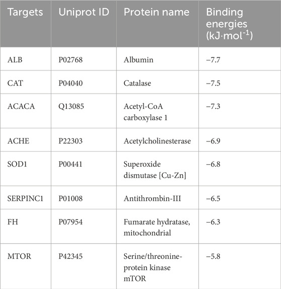 Figure 8. The protein ligands of the docking simulation. (a) Docking of GPA with ACACA. (b) Docking of GPA with ACHE. (c) Docking of GPA with ALB. (d) Docking of GPA with CAT. (e) Docking of GPA with FH. (f) Docking of GPA with MTOR. (g) Docking of GPA with SERPINC1. (h) Docking of GPA with SOD1.