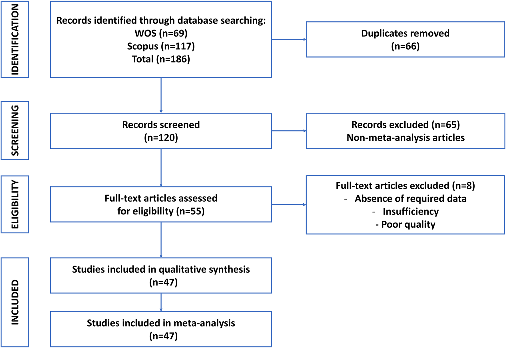 No new statistical analyses were performed in this umbrella review, as its primary goal was to synthesize and interpret results from existing meta-analyses. However, statistical metrics reported in the included studies were carefully reviewed and verified for accuracy to ensure the reliability of the synthesized findings.